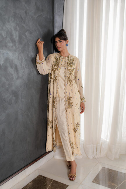 A stunning yellow pure raw silk co-ord set, featuring a long shirt with dramatic sleeves. The intricately embroidered neckline, adorned with embellishments, adds a touch of elegance, perfectly complemented by sleek straight pants for a sophisticated finish