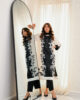 An elegantly crafted raw silk shirt adorned with intricate hand-embellished detailing, paired with a flowing chiffon dupatta and tailored sleek pants for a timeless, sophisticated look