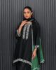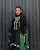 A black pure raw silk shirt adorned with intricate embroidery and embellishments on the neckline and sleeves, paired with a classic farshi shalwar and a chiffon dupatta