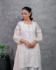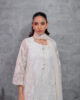 A cotton net shirt, exquisitely embellished with intricate handwork, paired with a matching chiffon dupatta and tailored farshi shalwar