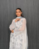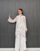 A timeless ensemble featuring a short, sophisticated white cotton-net shirt adorned with intricate grey embroidery, exuding understated grace. Paired effortlessly with our signature flared pants for a touch of modern flair, and completed with a soft chiffon tie-and-dye dupatta that adds a delicate, artistic finish to the look.