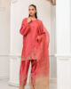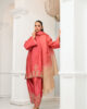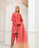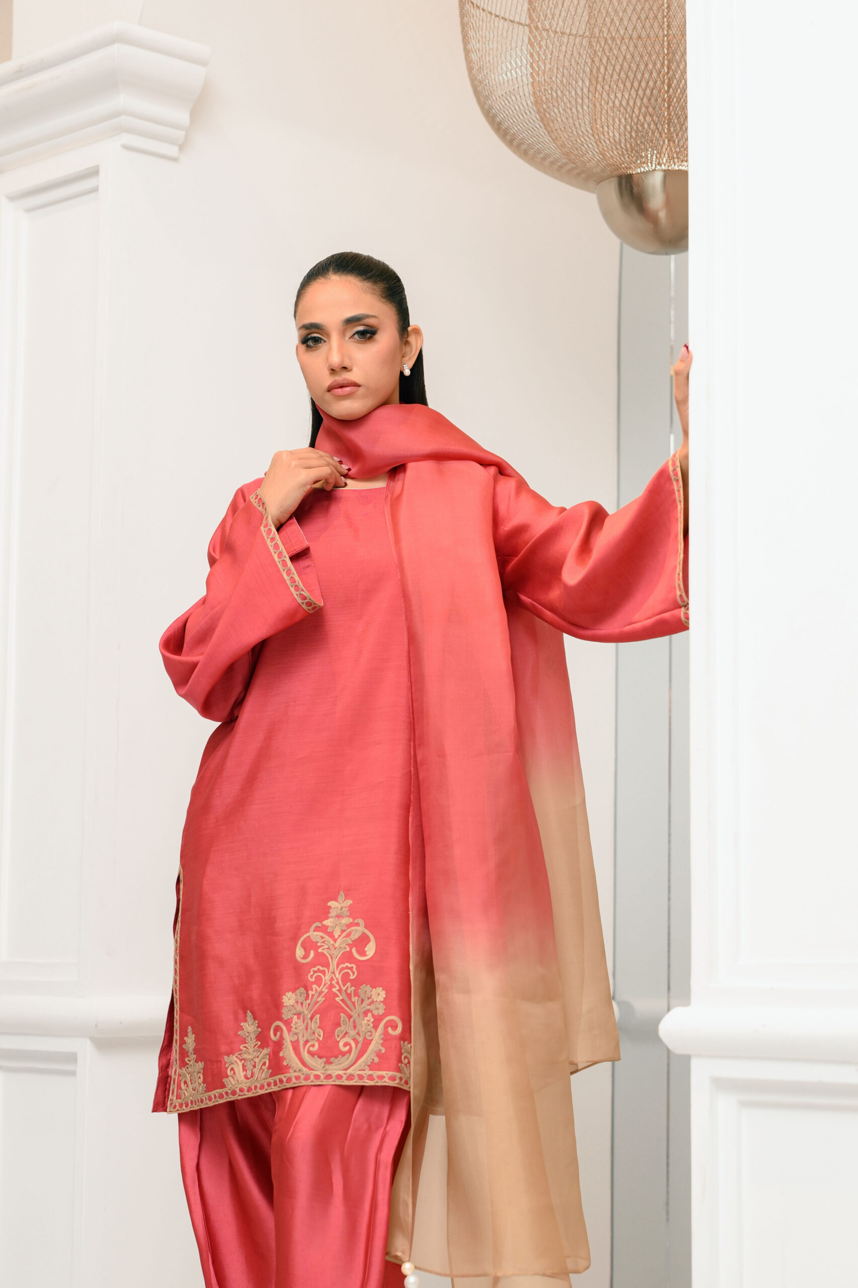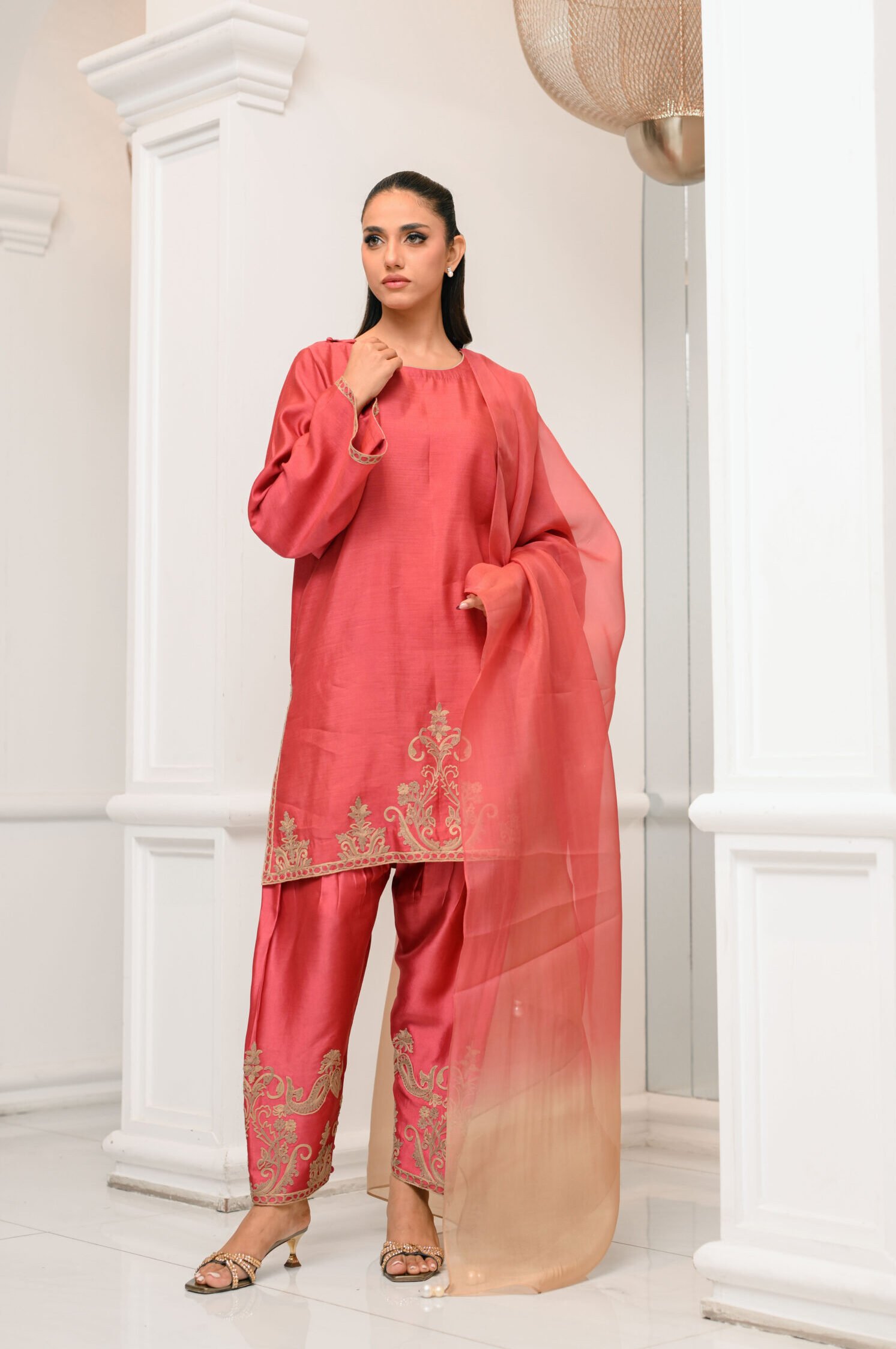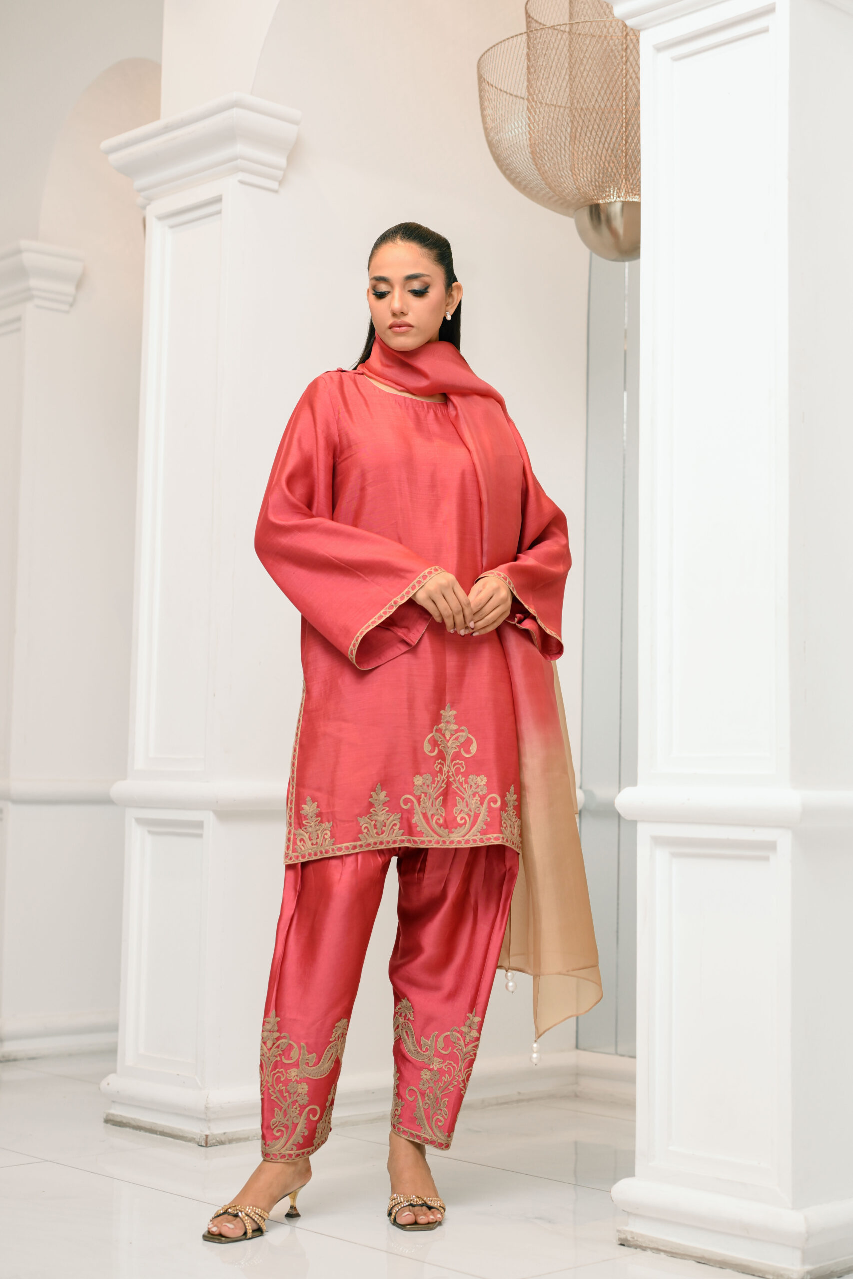 A statement khaddi silk shirt in coral pink featuring a short silhouette, intricately hand-embroidered in gold and accented with delicate embellishments and tassel detailing. Paired with an embroidered tapered shalwar and a sequinned organza dupatta — exuding timeless festive elegance