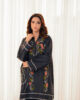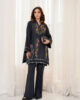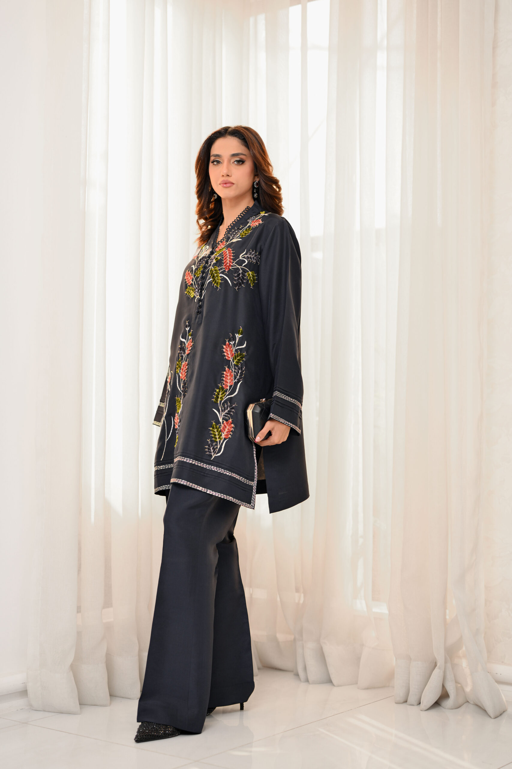 A short, intricately embroidered Korean silk shirt, tailored to perfection and paired with sleek boot-cut pants for an effortlessly chic look