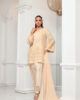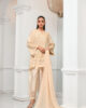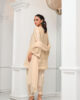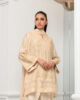 A graceful ivory ensemble featuring a delicately embroidered shirt in self-tones, showcasing intricate craftsmanship and timeless elegance. It is paired with a tapered shalwar accentuated with cutwork borders and completed with a soft chiffon dupatta for a refined, sophisticated look