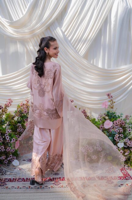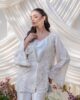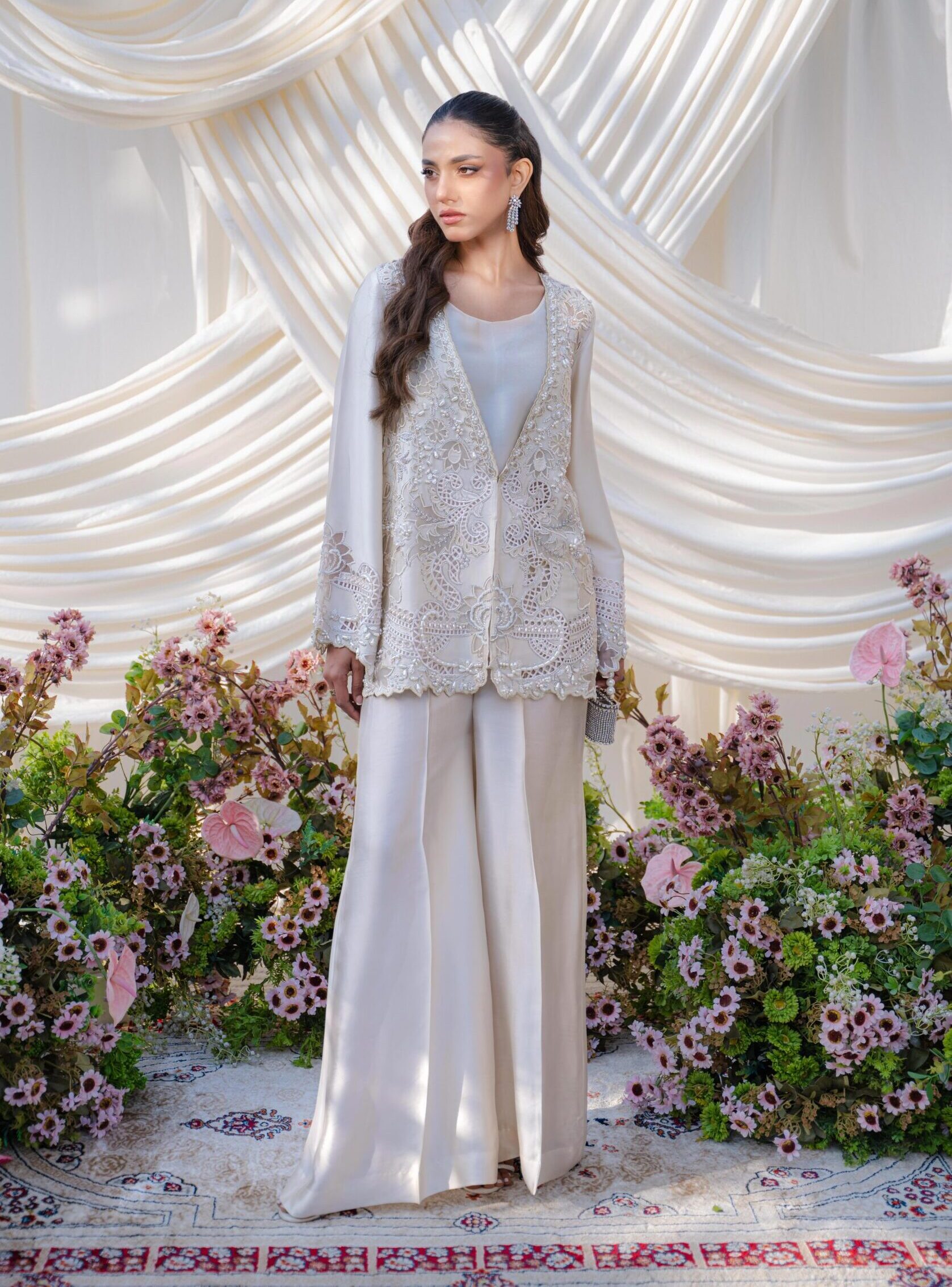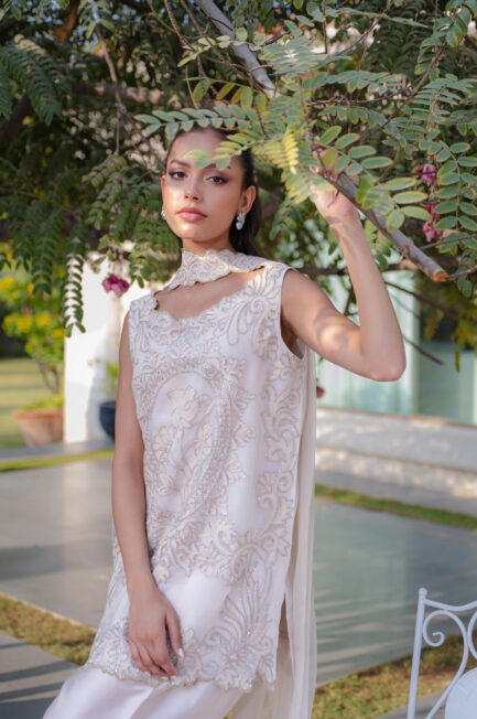 A luxurious ivory jacket featuring intricate self hand embroidery for an elevated, refined look, paired with tailored boot-cut pants for a sleek finish.