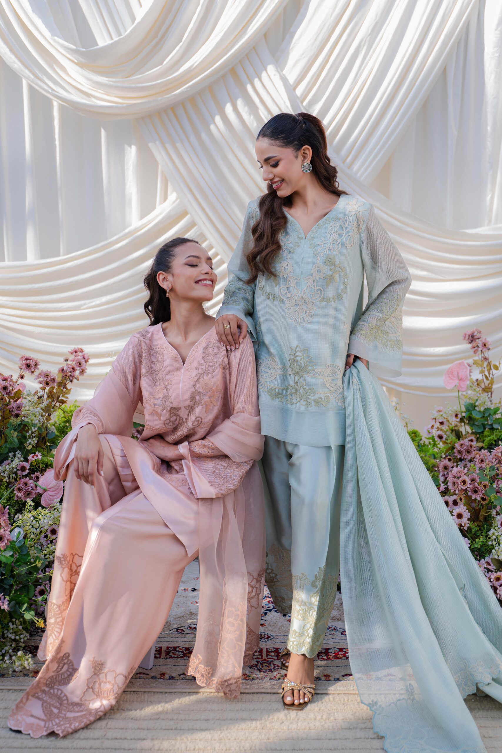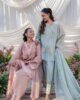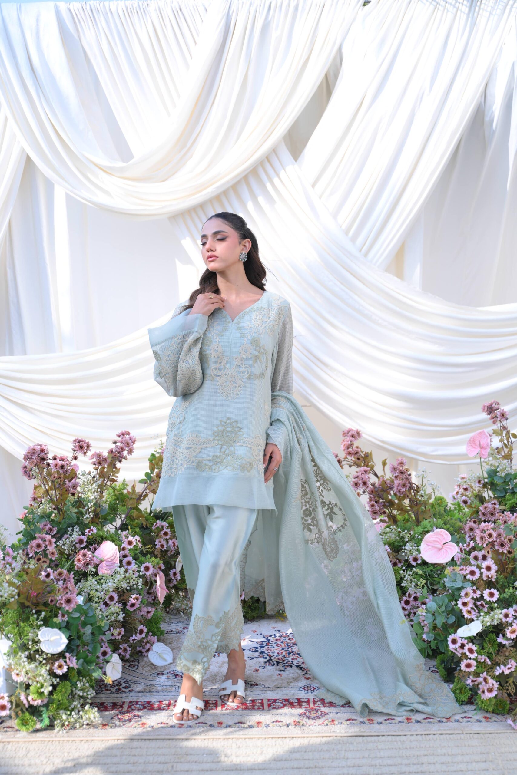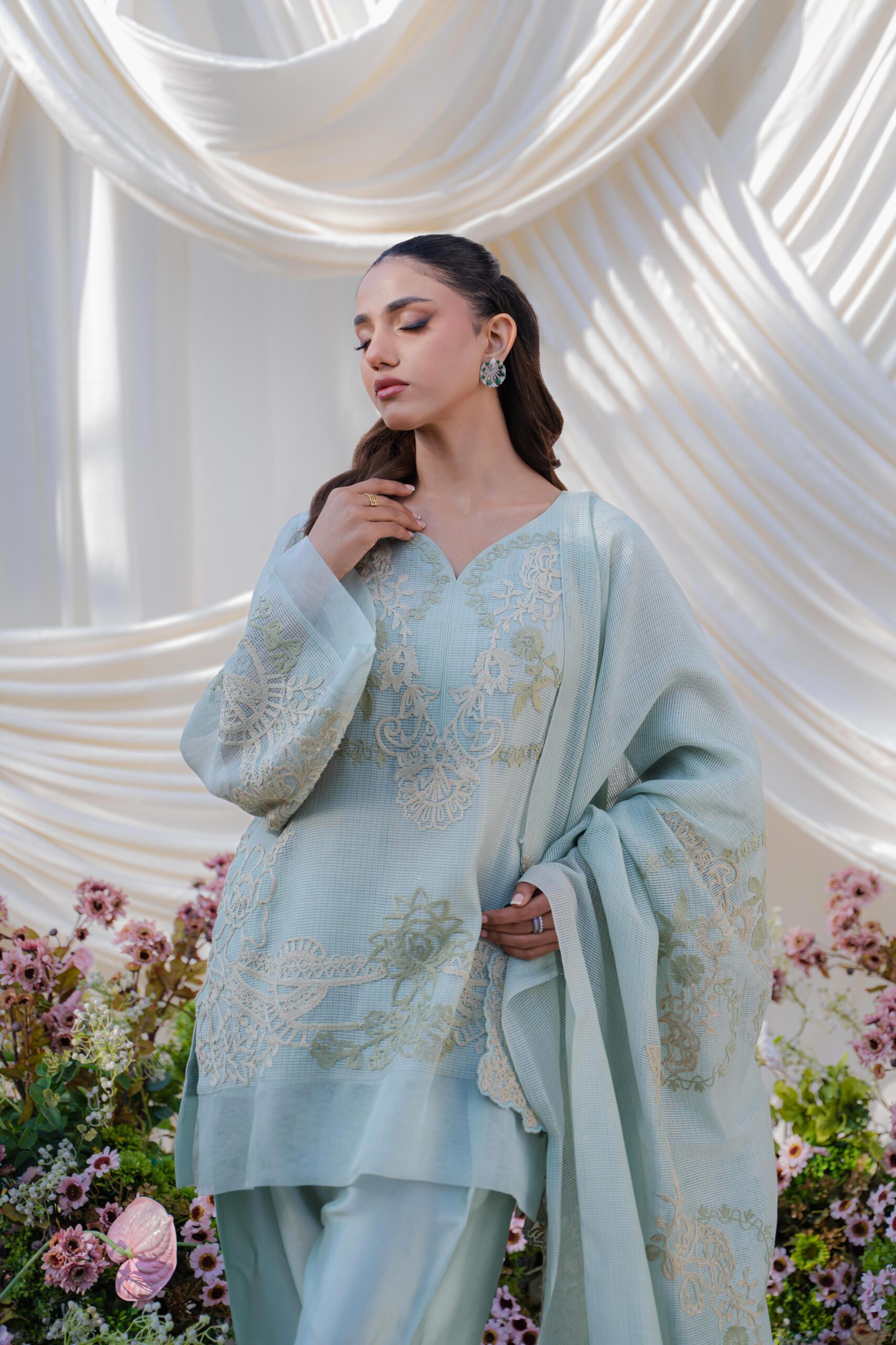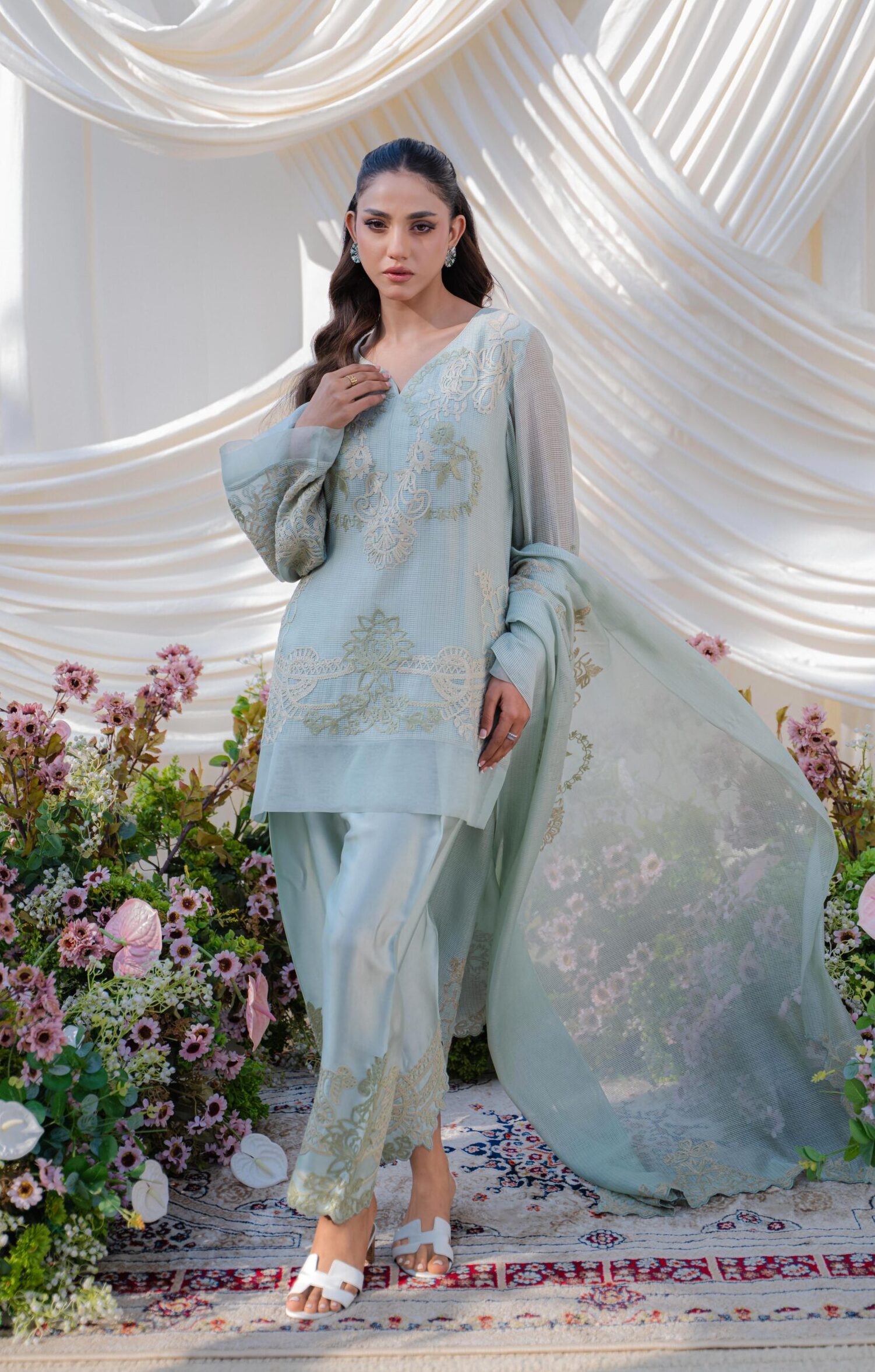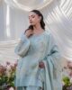 An intricately embroidered khaddi net, paired with a statement border shalwar and a delicately detailed organza dupatta.