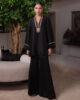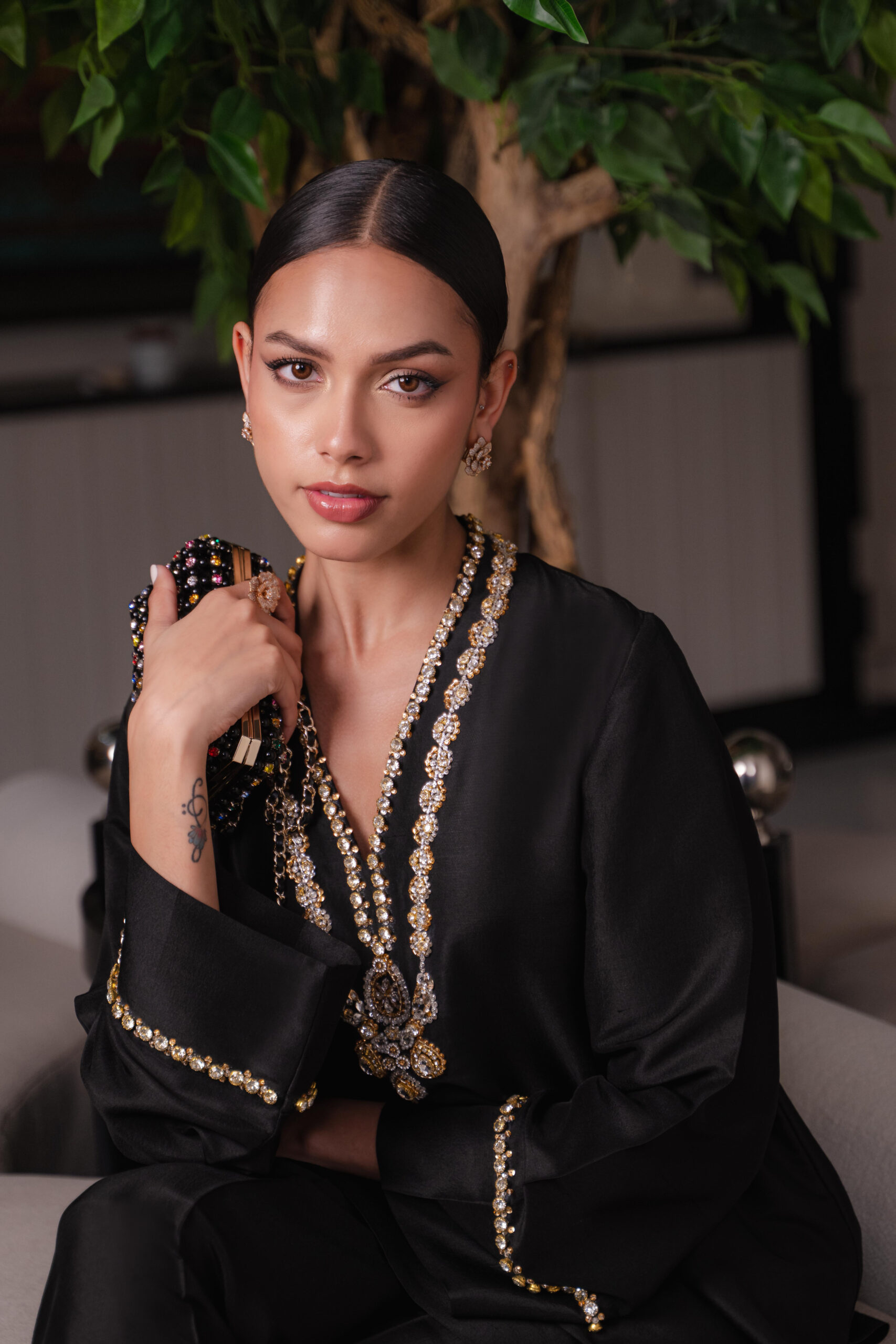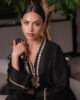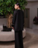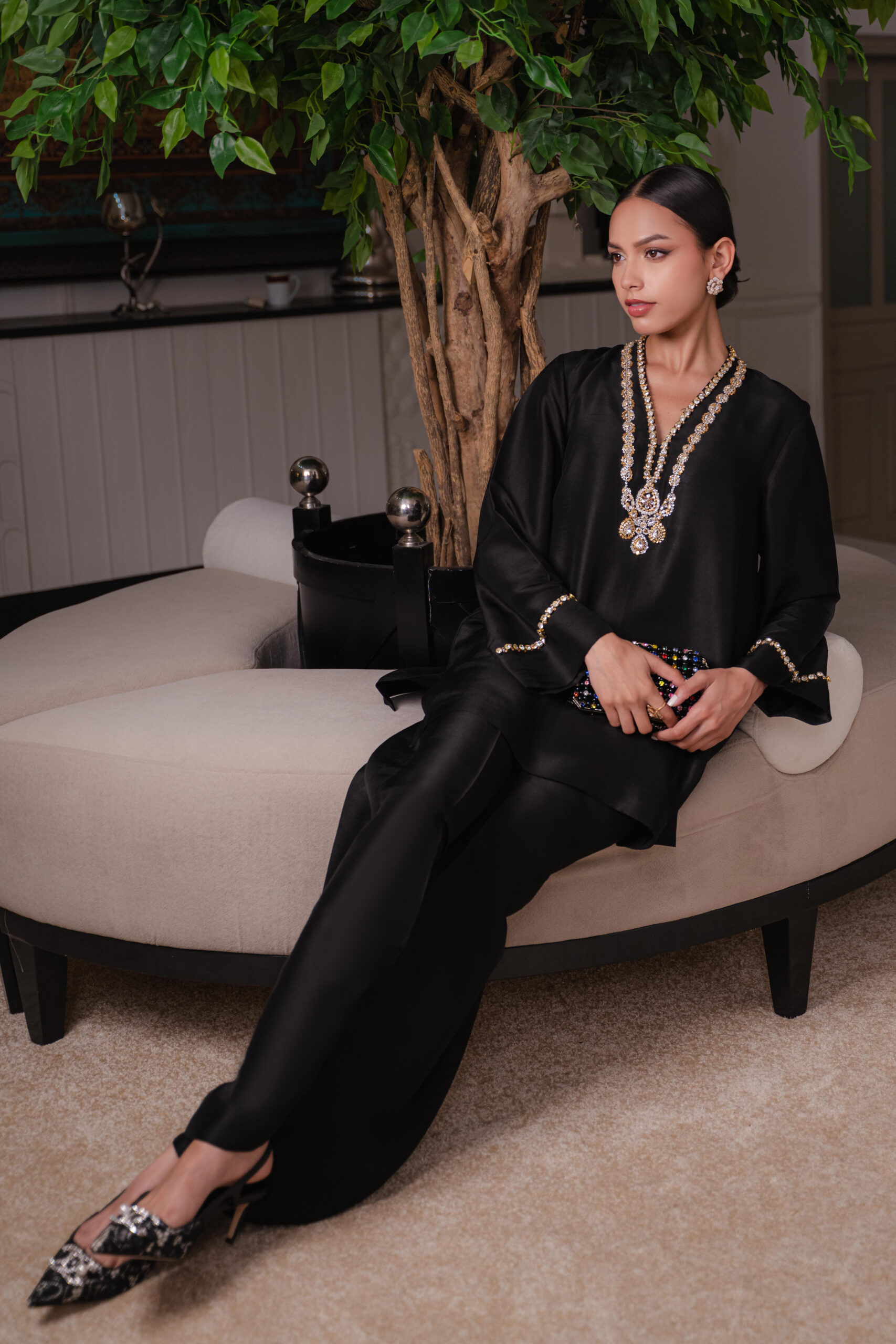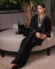 A luxurious pure raw silk shirt adorned with delicate stone embellishments and intricate hand embroidery, exuding refined elegance. Paired with plain black raw silk culottes, for a sophisticated look