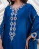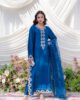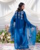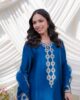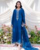 A luxurious teal blue long shirt adorned with exquisite beige embroidery on the neckline and intricate self-embroidery on the back neck, creating an elevated, refined look. Paired with sleek tailored pants and finished with a delicately detailed organza dupatta.