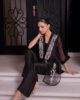 A statement black organza jacket adorned with intricate pastel-hued embroidery, designed for the modern muse. Paired with our classic boot cut pants, this ensemble blends contemporary elegance with timeless grace.