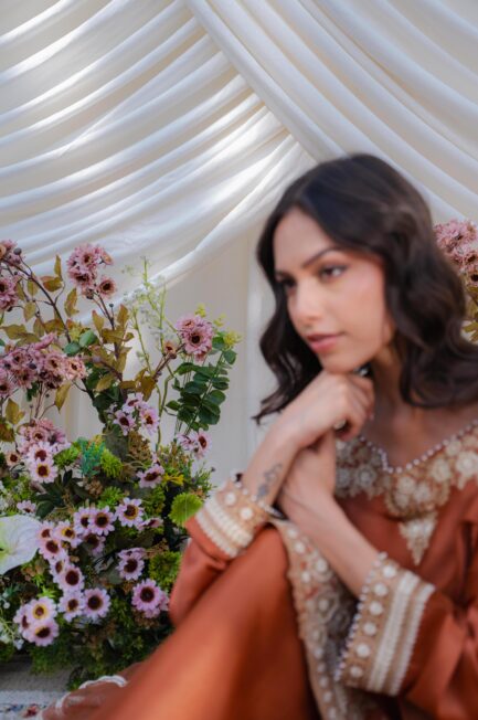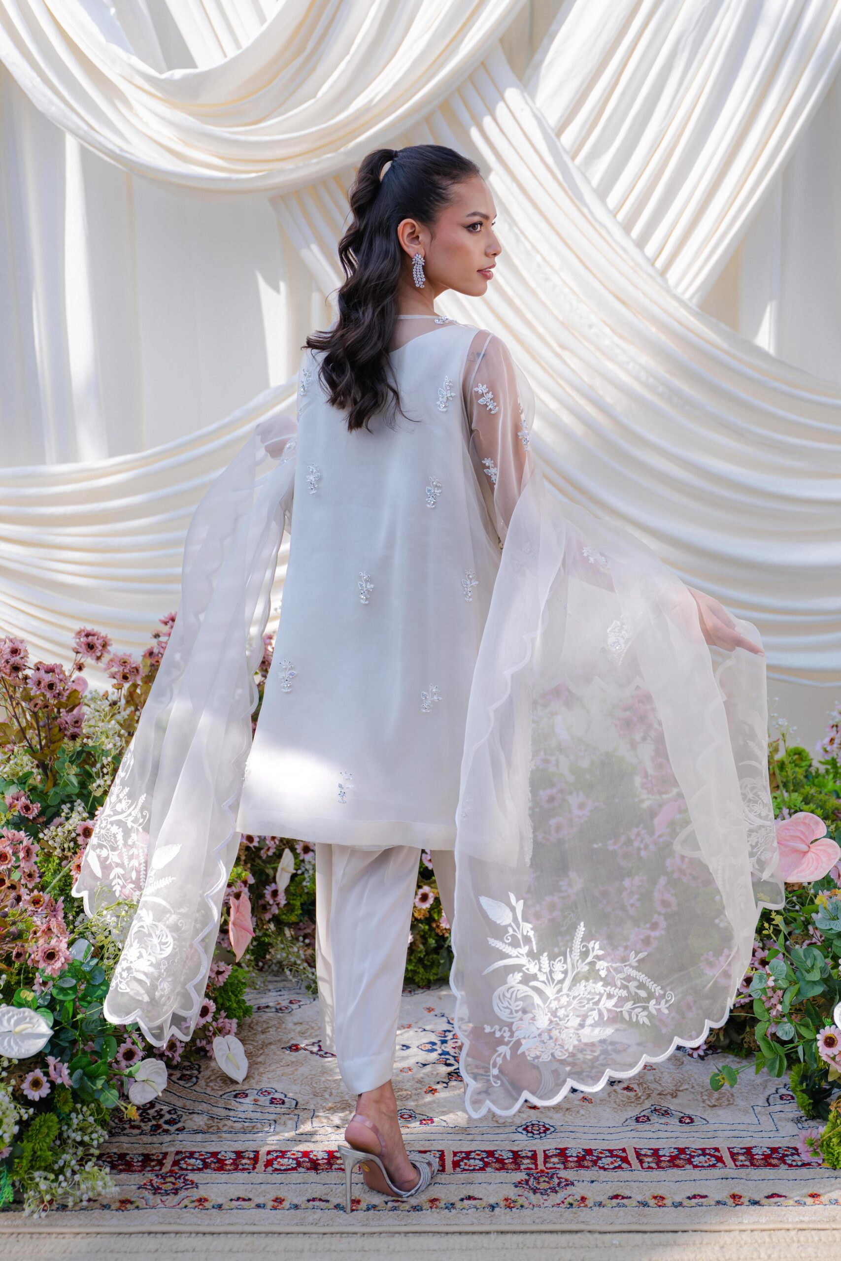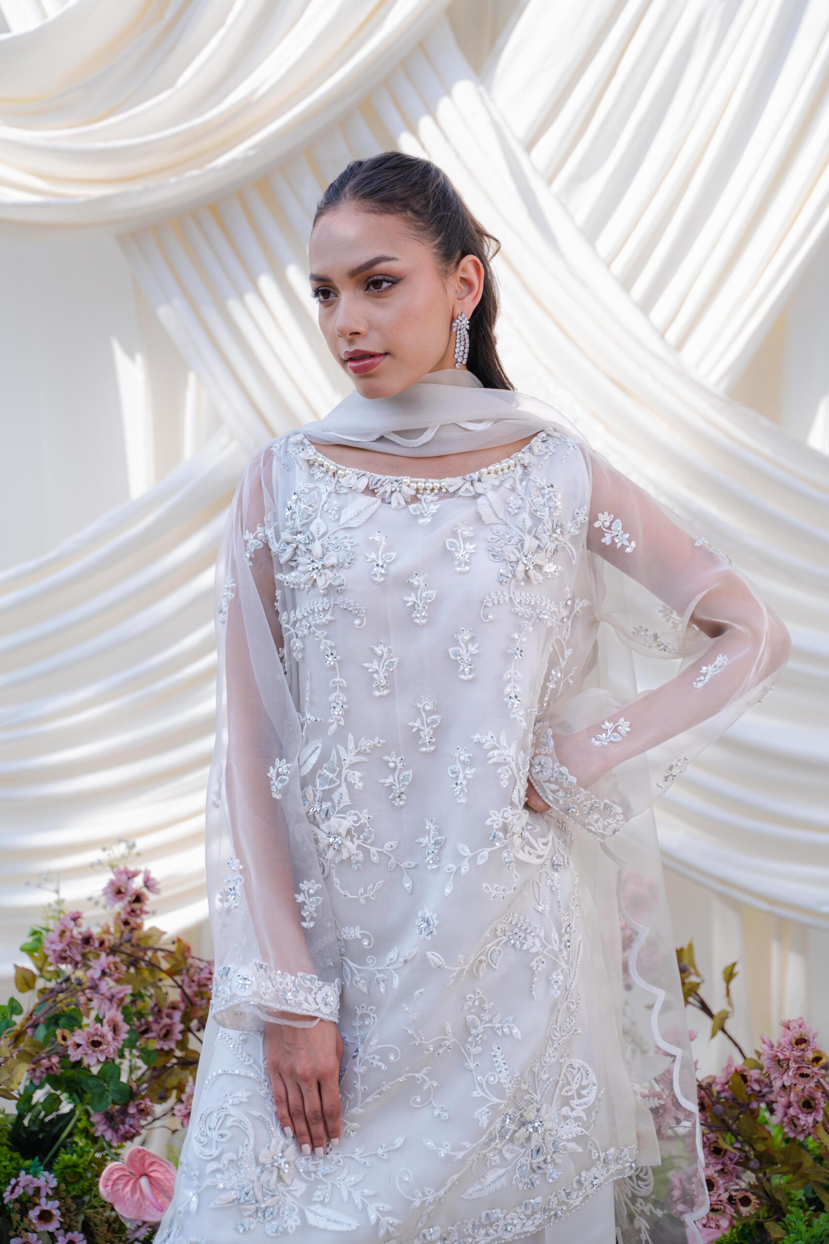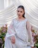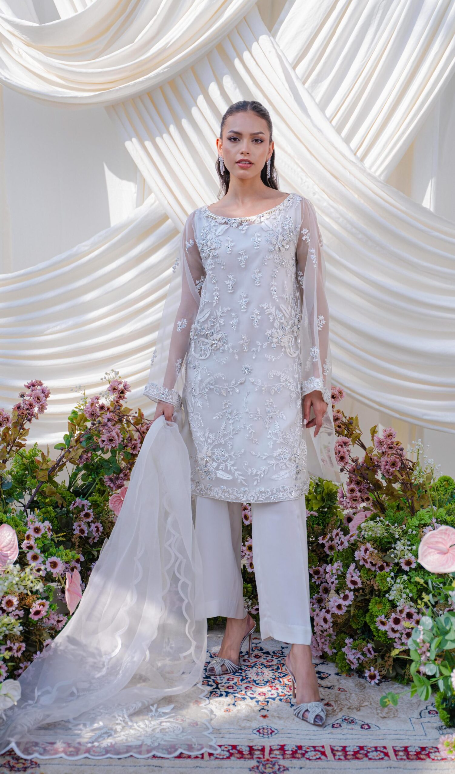 A breathtaking organza shirt, exquisitely hand-embroidered with intricate detailing, radiating timeless elegance. Paired with sleek culottes and a delicately crafted organza dupatta adorned with subtle scattered embroidery and fine finishing