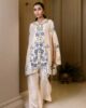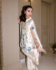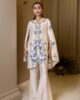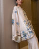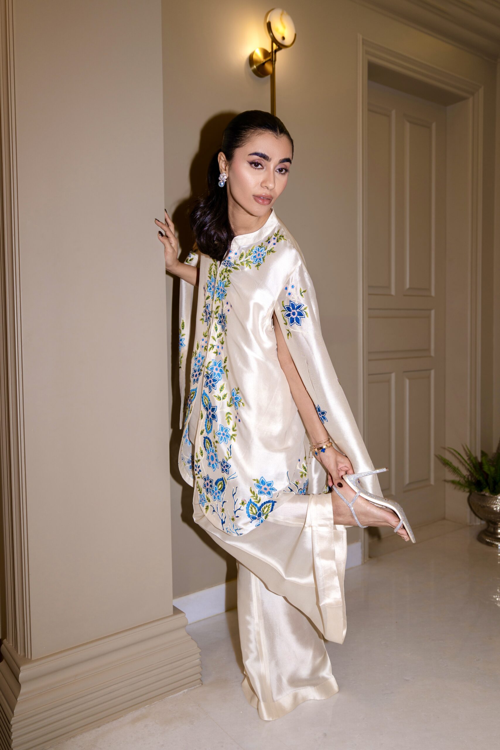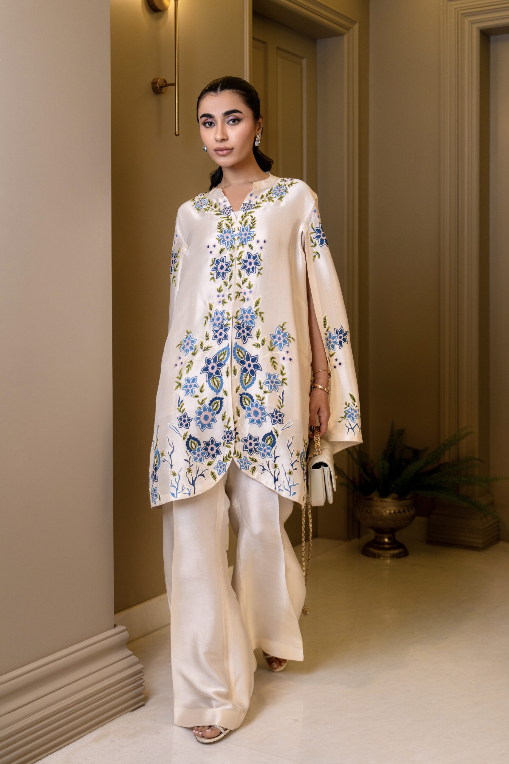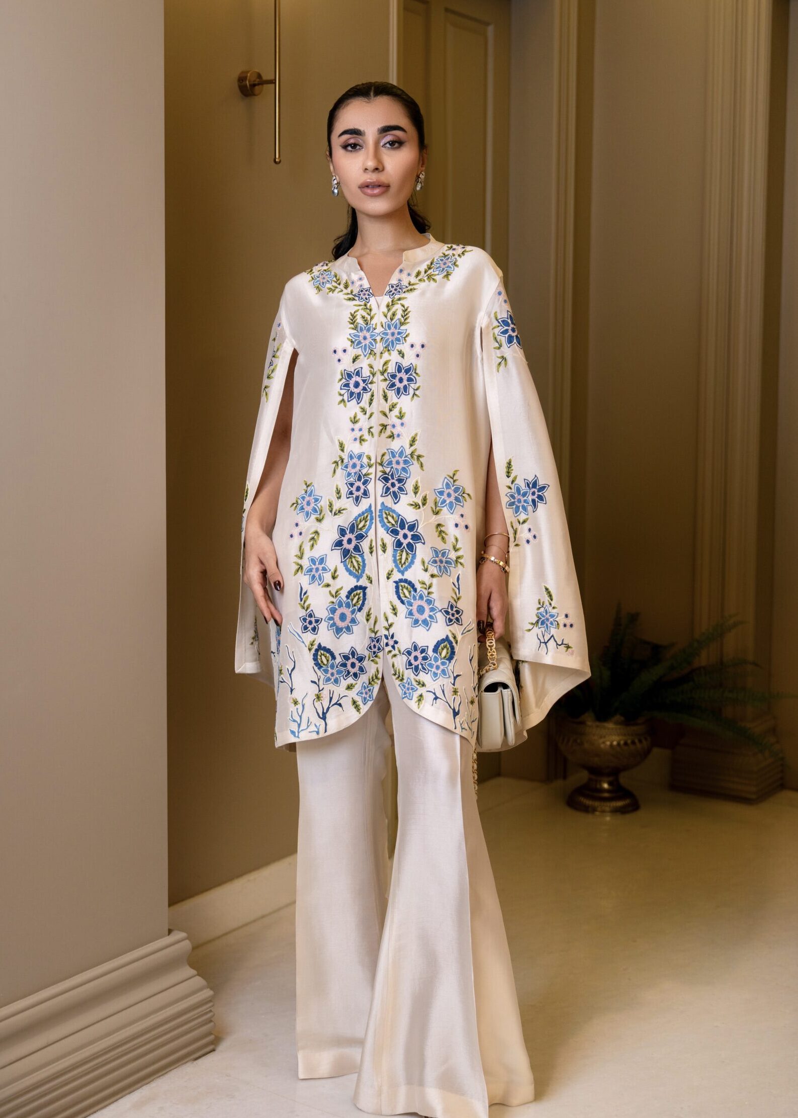 An elegant shisha silk cape  featuring delicate intricate embroidery, paired with tailored sleek boot cut pants to create a timeless and sophisticated ensemble