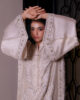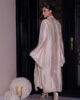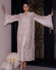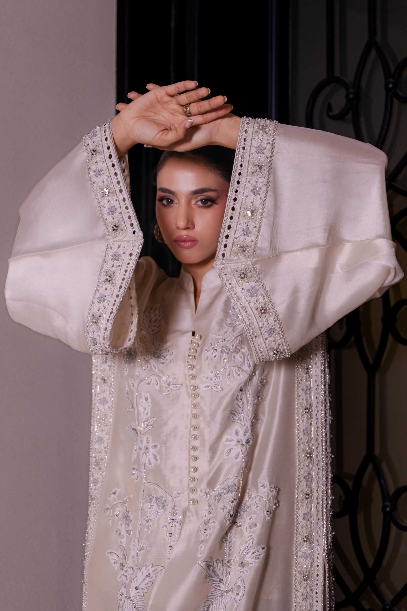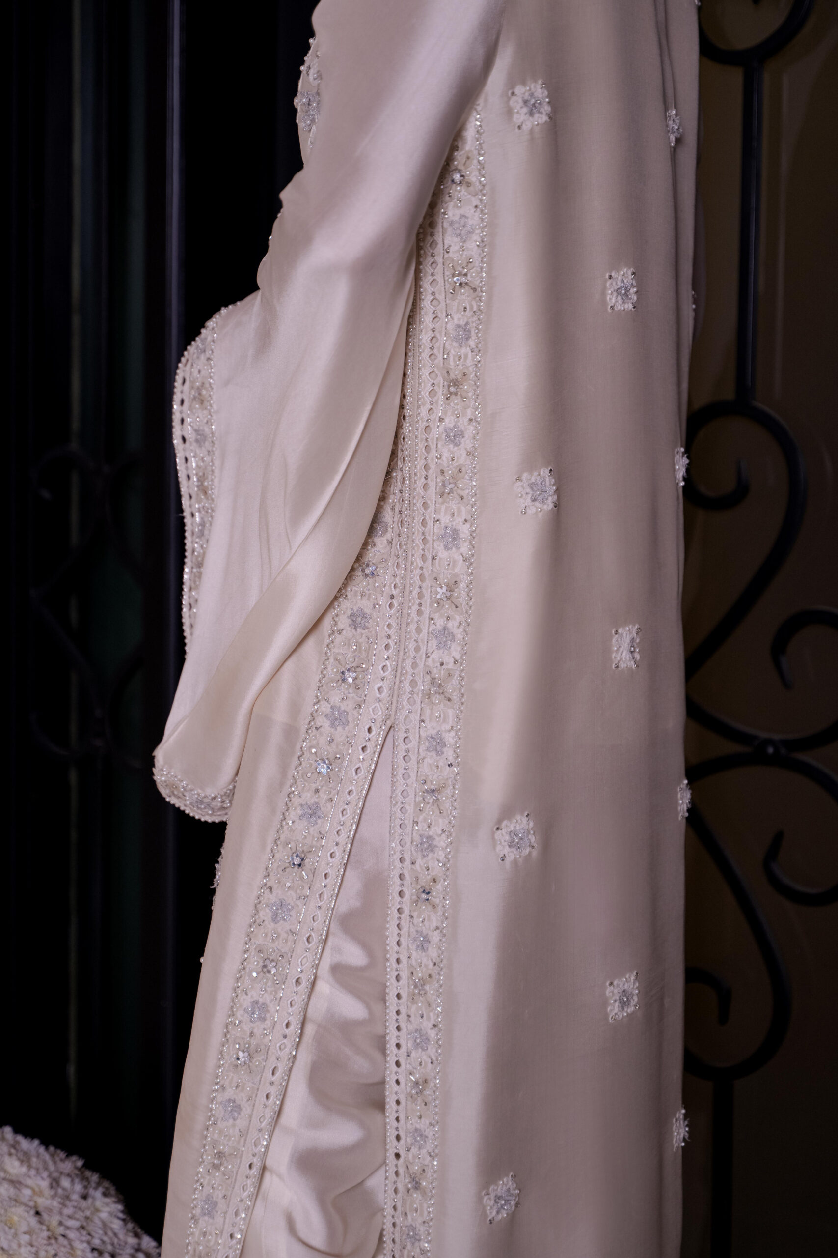 An exquisitely crafted ivory shirt adorned with intricate hand embroidery and embelishments, paired with sleek tailored pants — the perfect ensemble for your most elegant formal affairs