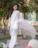 A stunning short cotton net shirt adorned with intricate embroidery along the neckline, daman, and sleeve borders, exuding refined elegance. Paired with chic culottes and a beautifully crafted organza dupatta featuring delicate scattered embroidery and detailed finishing.