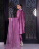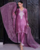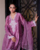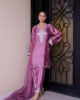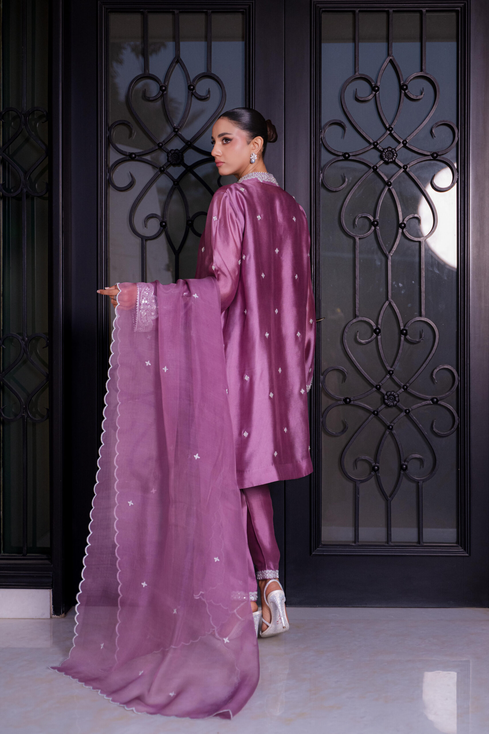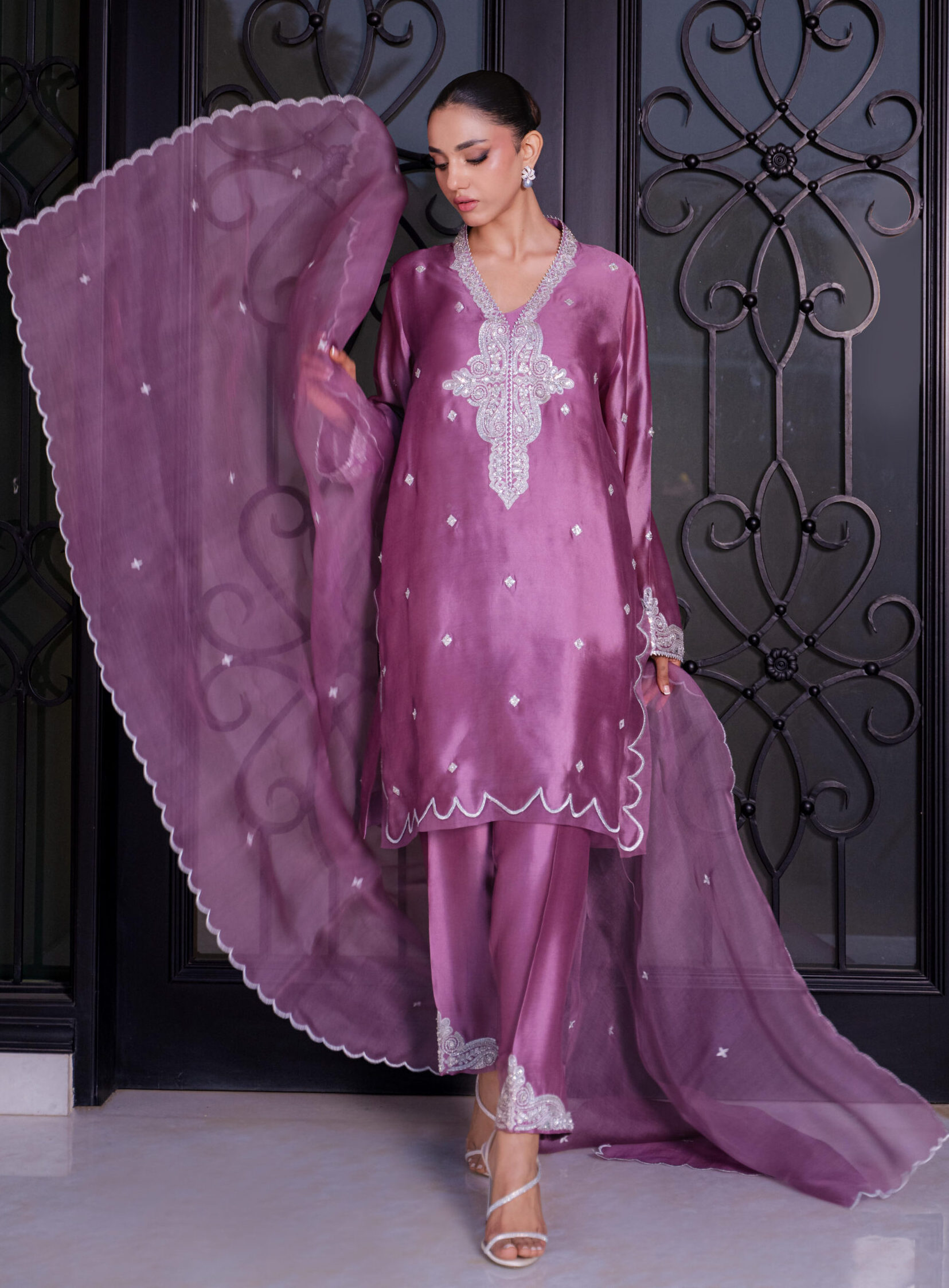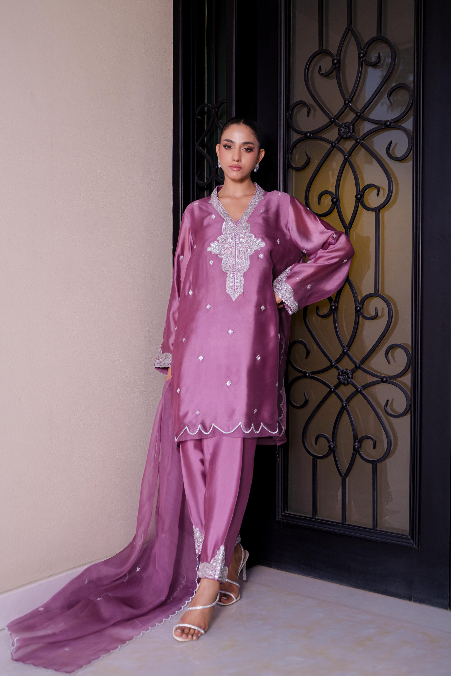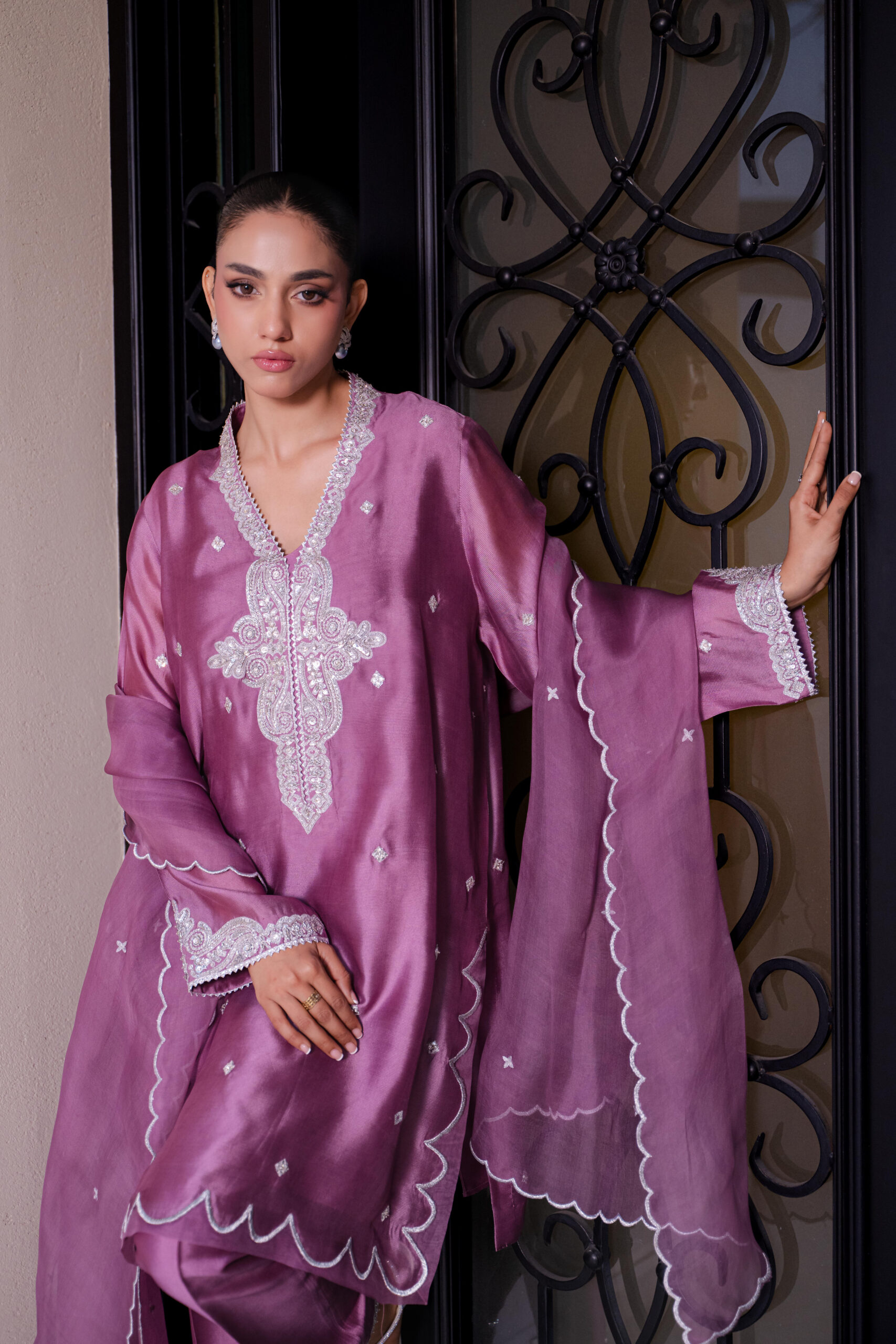 A dreamy mauve shisha silk ensemble featuring an intricately hand-embroidered neckline with delicate motifs scattered gracefully throughout. Paired with a tailored tapered shalwar adorned with embroidered borders for a refined, polished finish. Completed with a sheer organza dupatta, beautifully detailed with scalloped edges and subtle embellishments for an effortlessly elegant look.