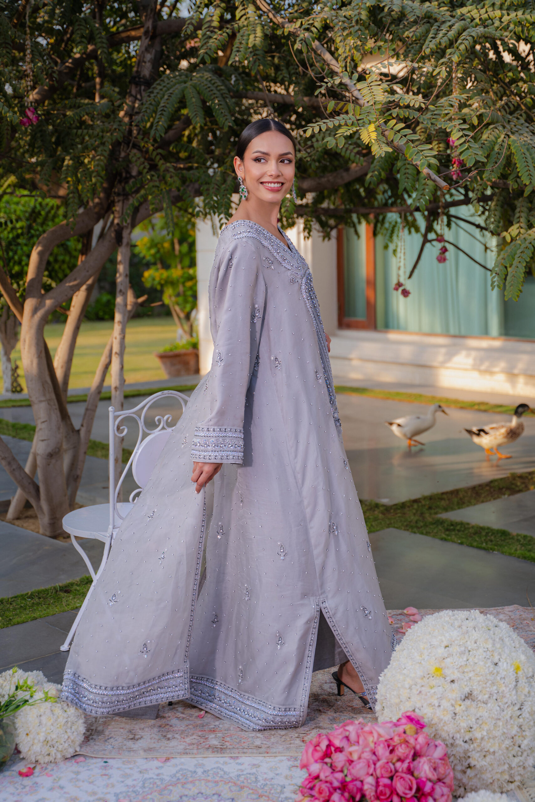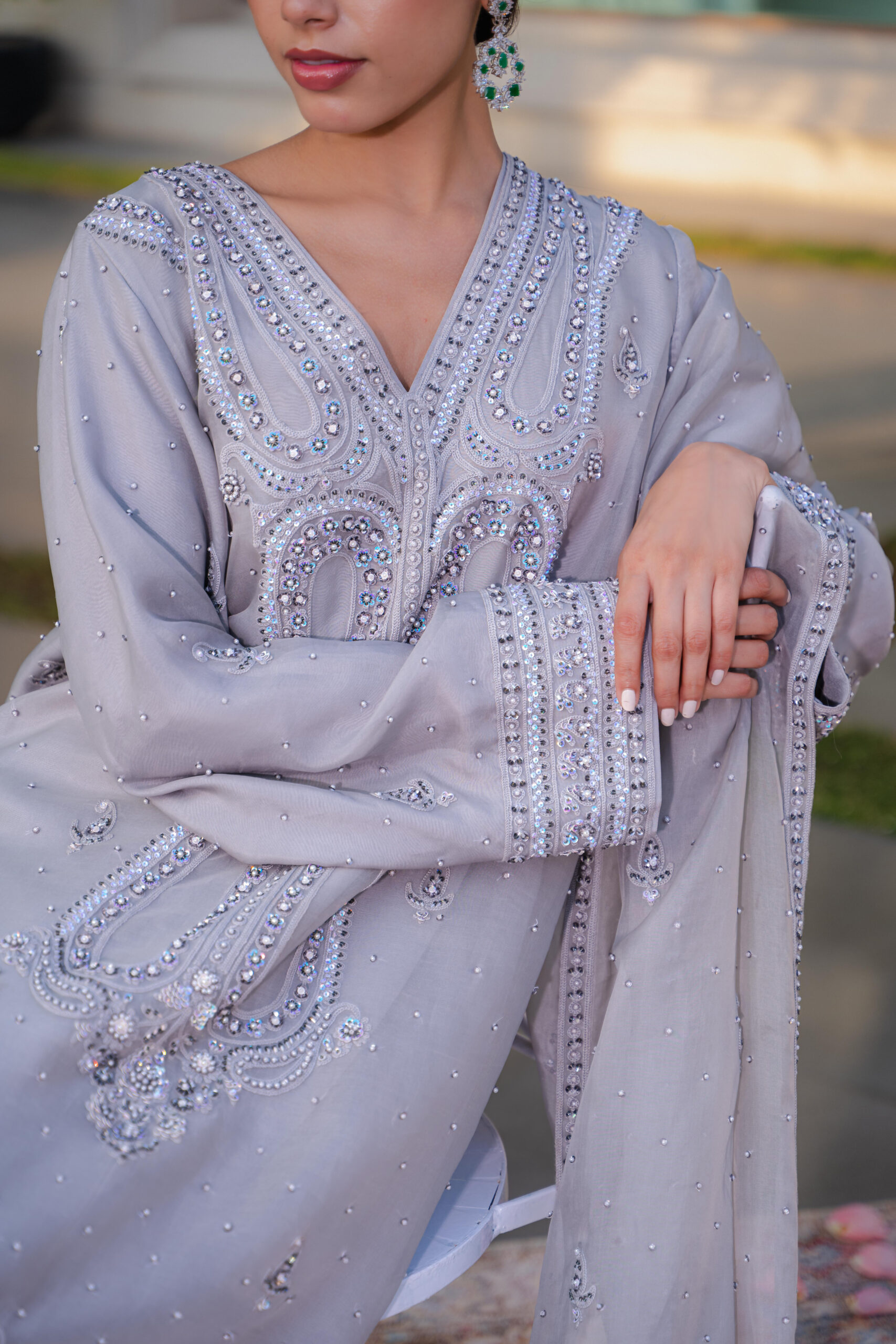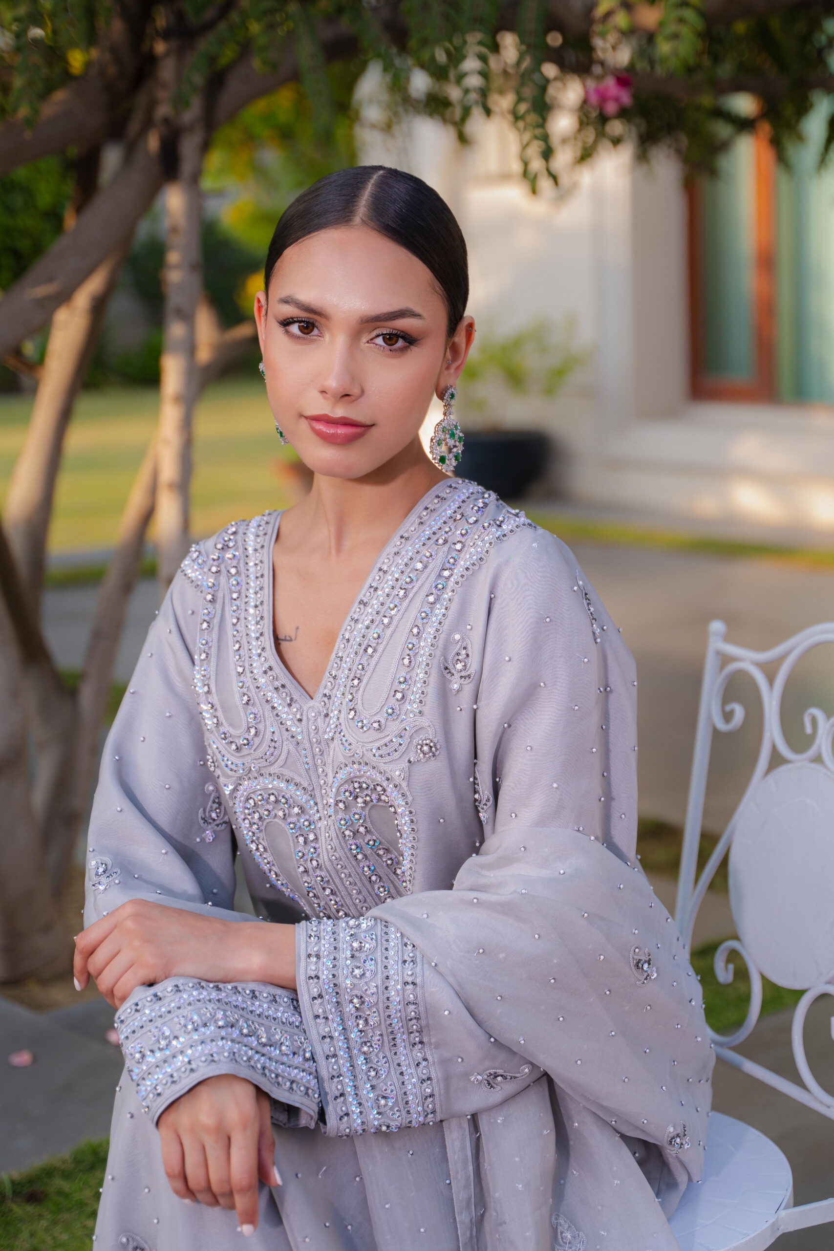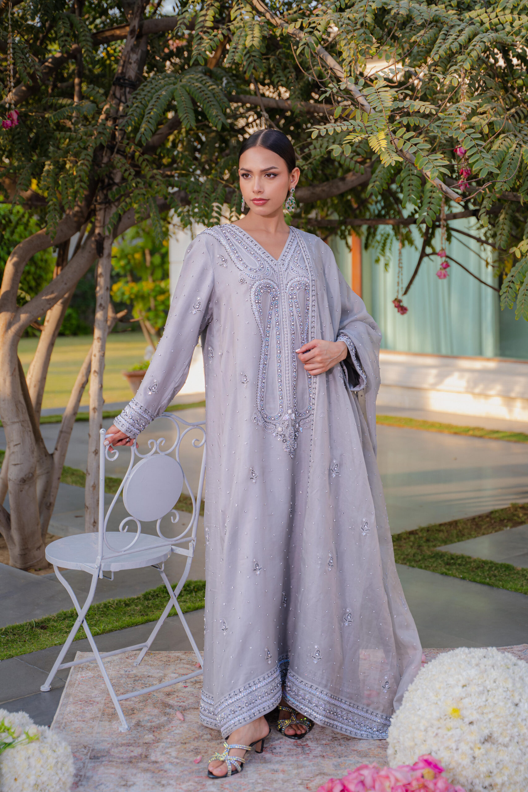 A luxurious pure organza kaftan, exquisitely adorned with intricate hand embroidery that reflects timeless craftsmanship. Paired with sleek raw silk pants and a delicately embroidered dupatta, perfect for refined festive and evening occasions
