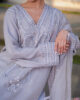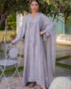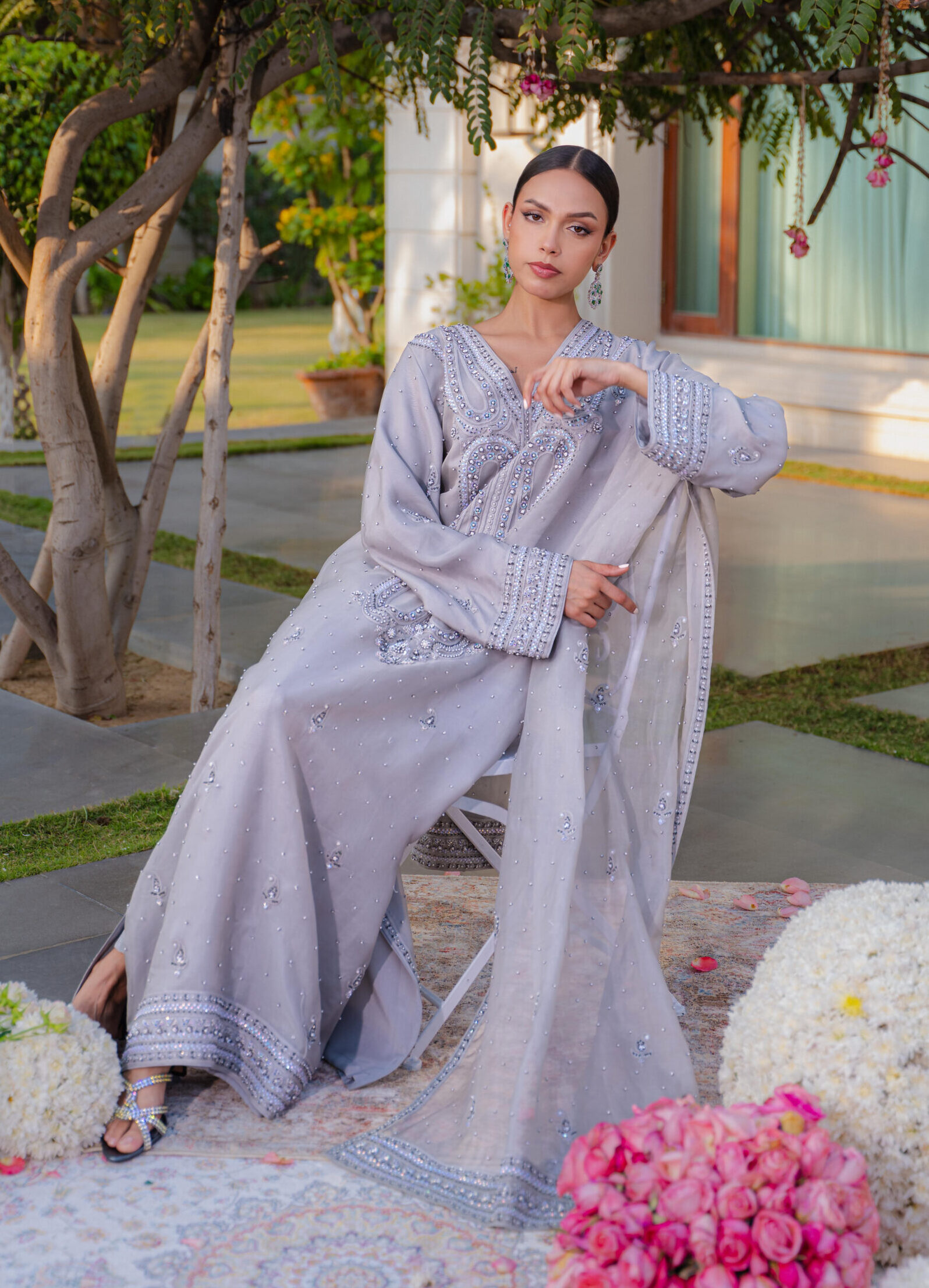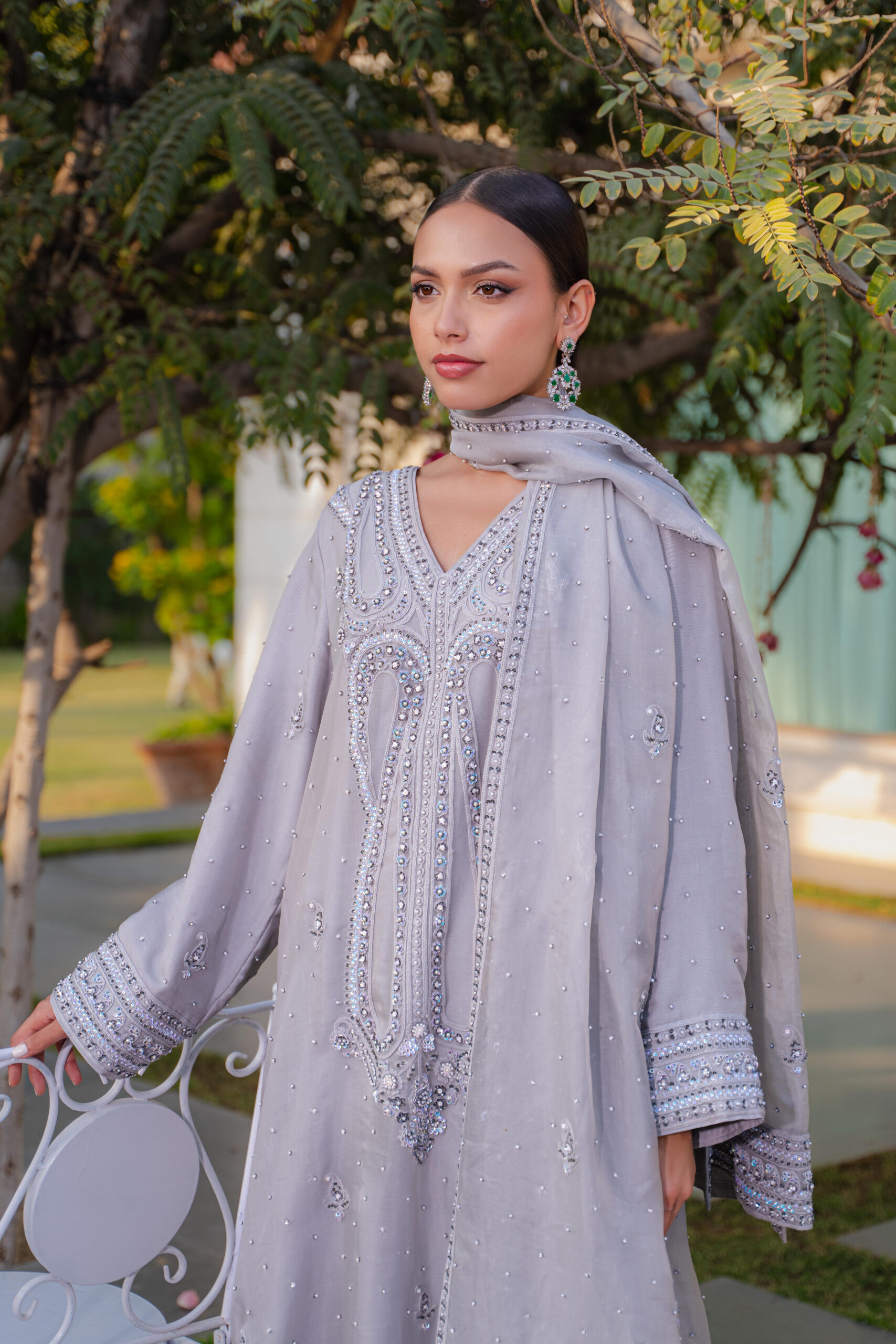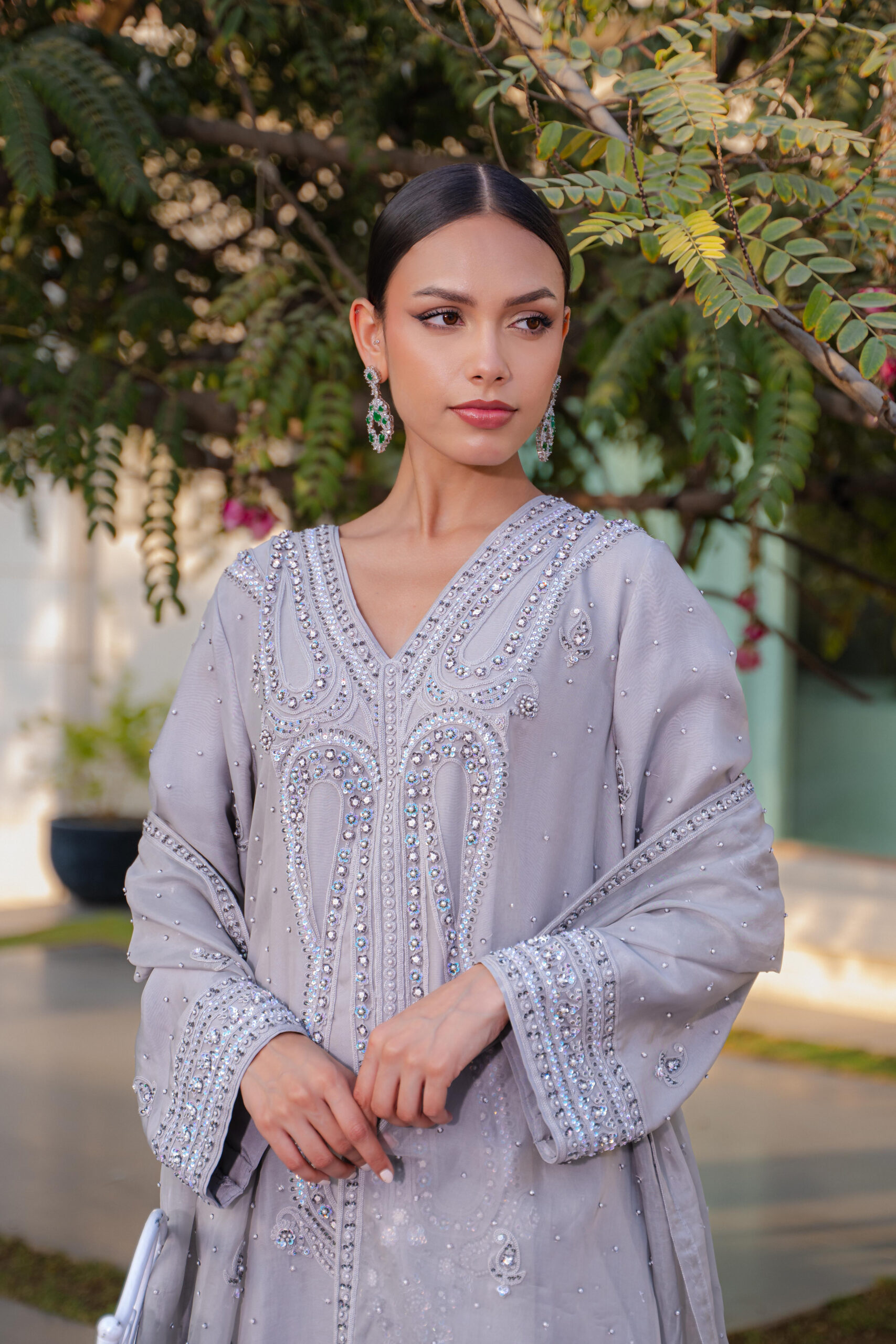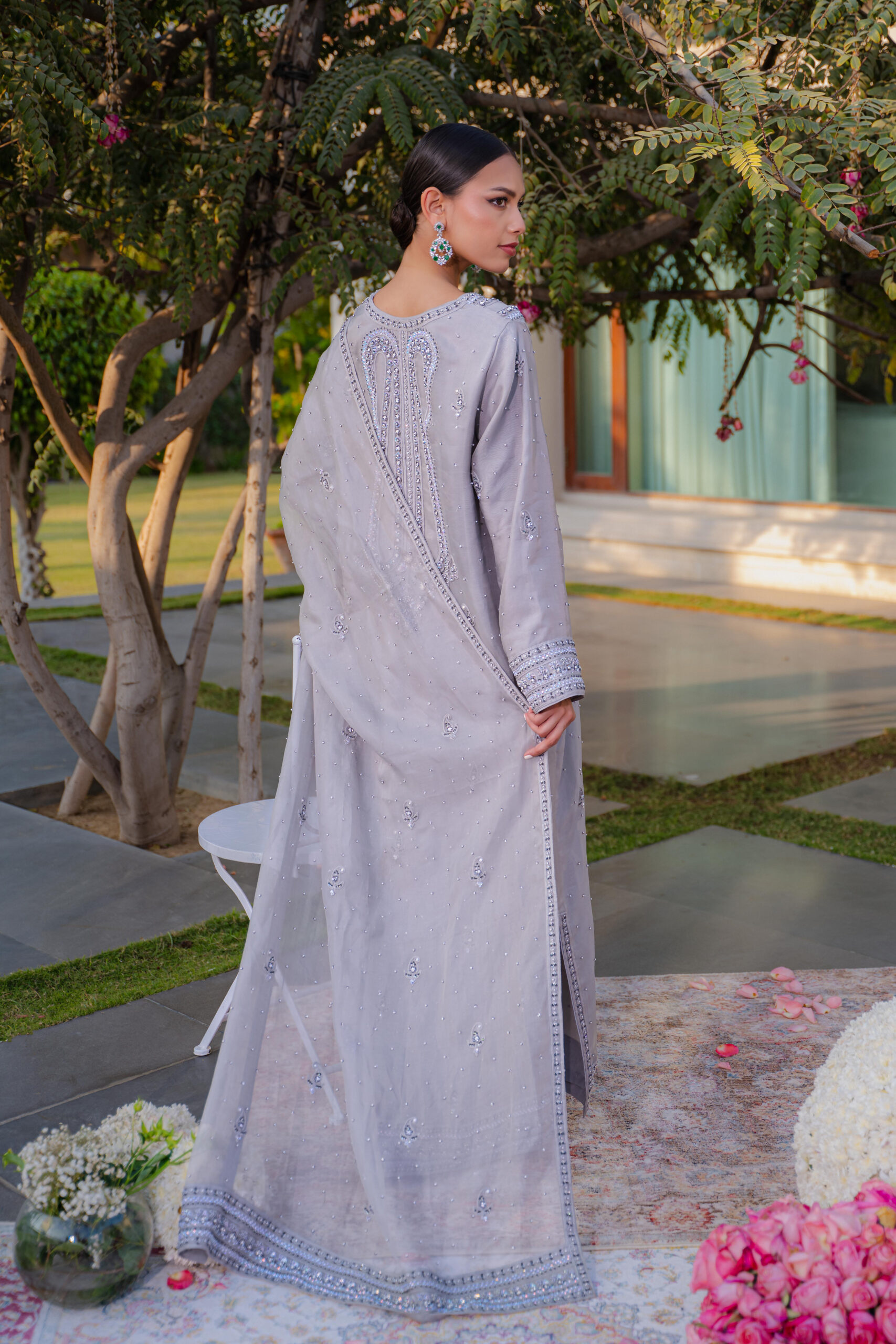 A luxurious pure organza kaftan, exquisitely adorned with intricate hand embroidery that reflects timeless craftsmanship. Paired with sleek raw silk pants and a delicately embroidered dupatta, perfect for refined festive and evening occasions