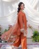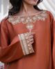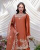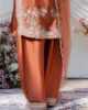 A stunning short shisha silk shirt adorned with intricate embroidery on the neckline, daman, and sleeve borders, exuding refined elegance. Paired with a classic shalwar and a beautifully crafted organza dupatta featuring delicate scattered embroidery and detailed finishing.