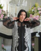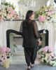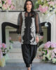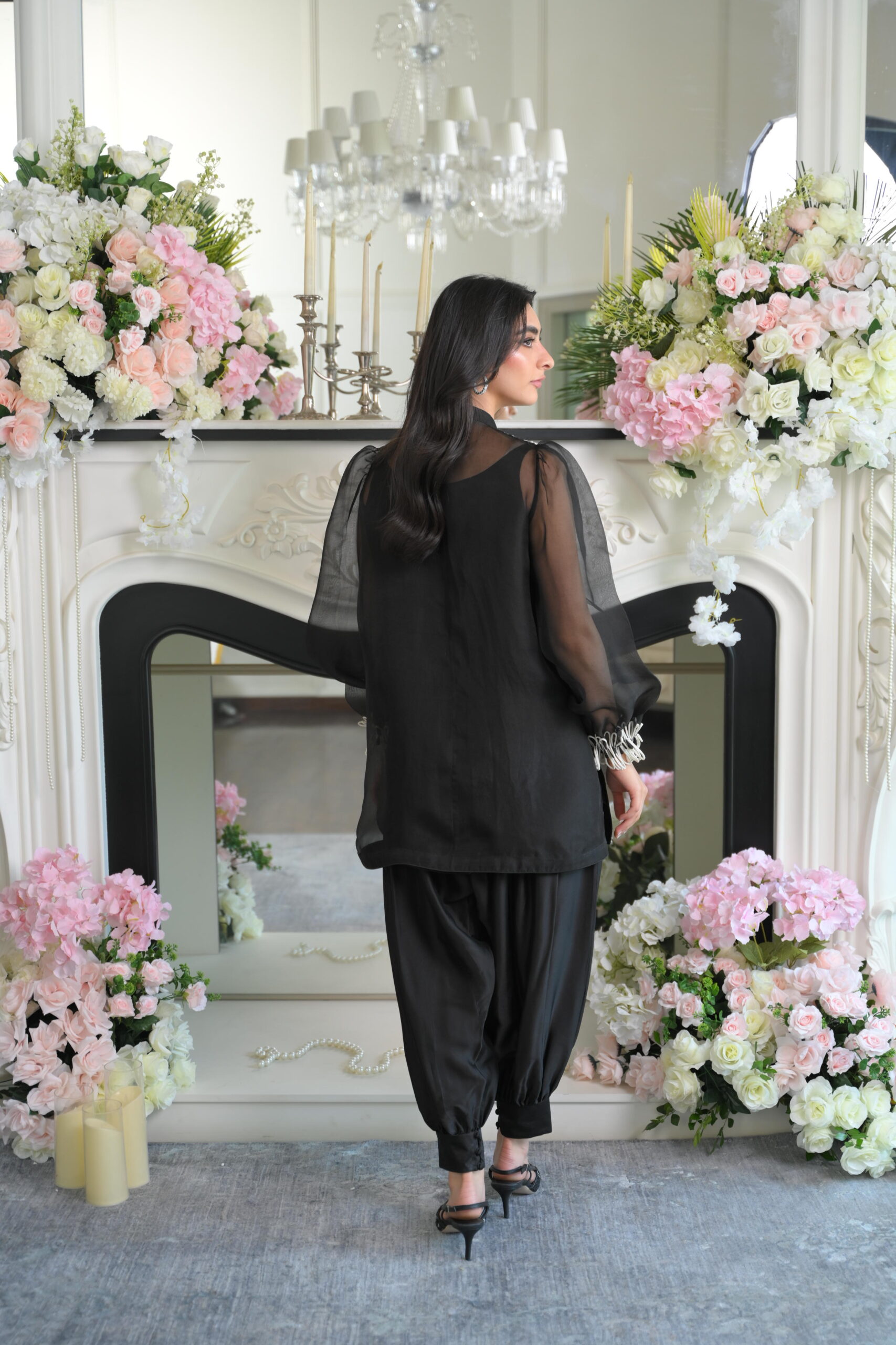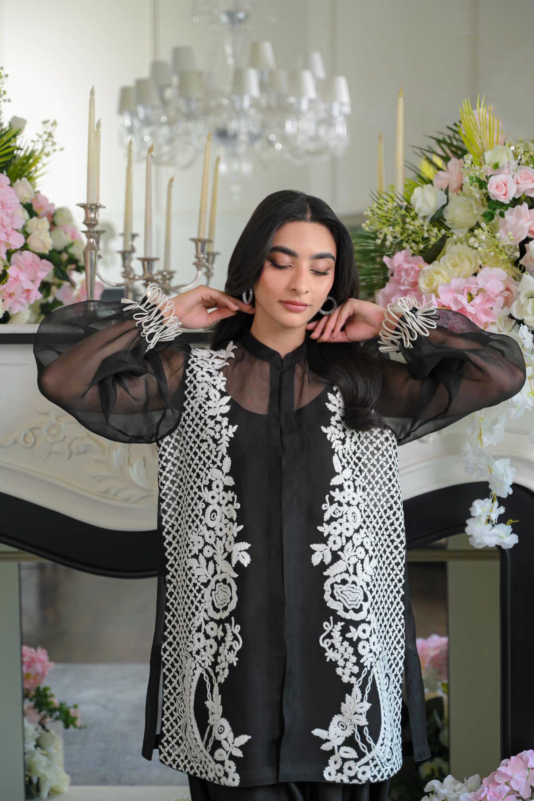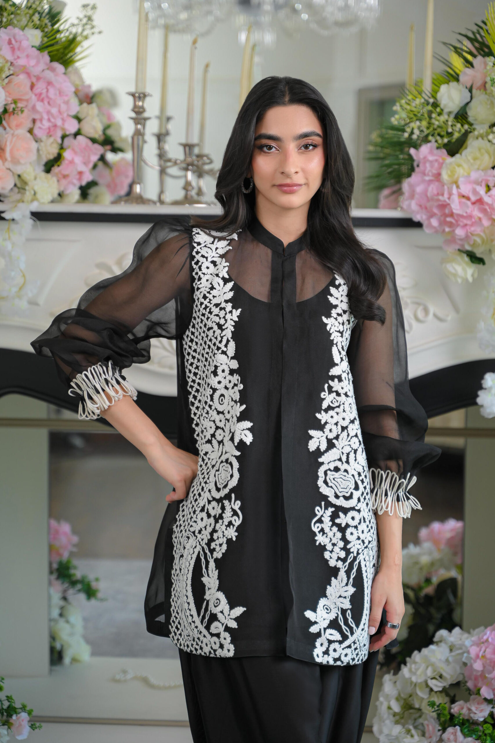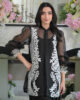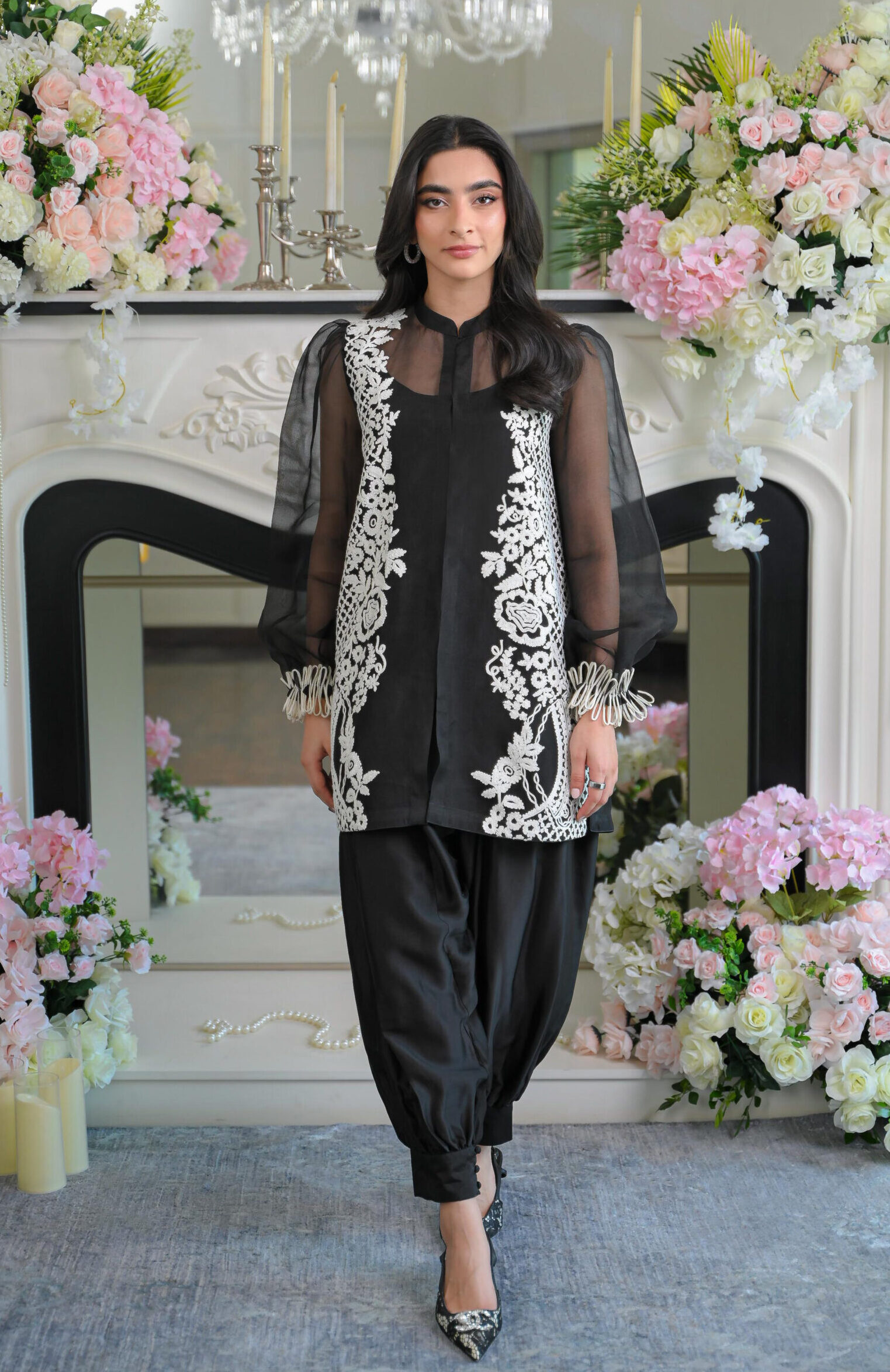 A black and white organza jacket adorned with intricate embroidery, paired with a classic shalwar for a timeless and graceful look