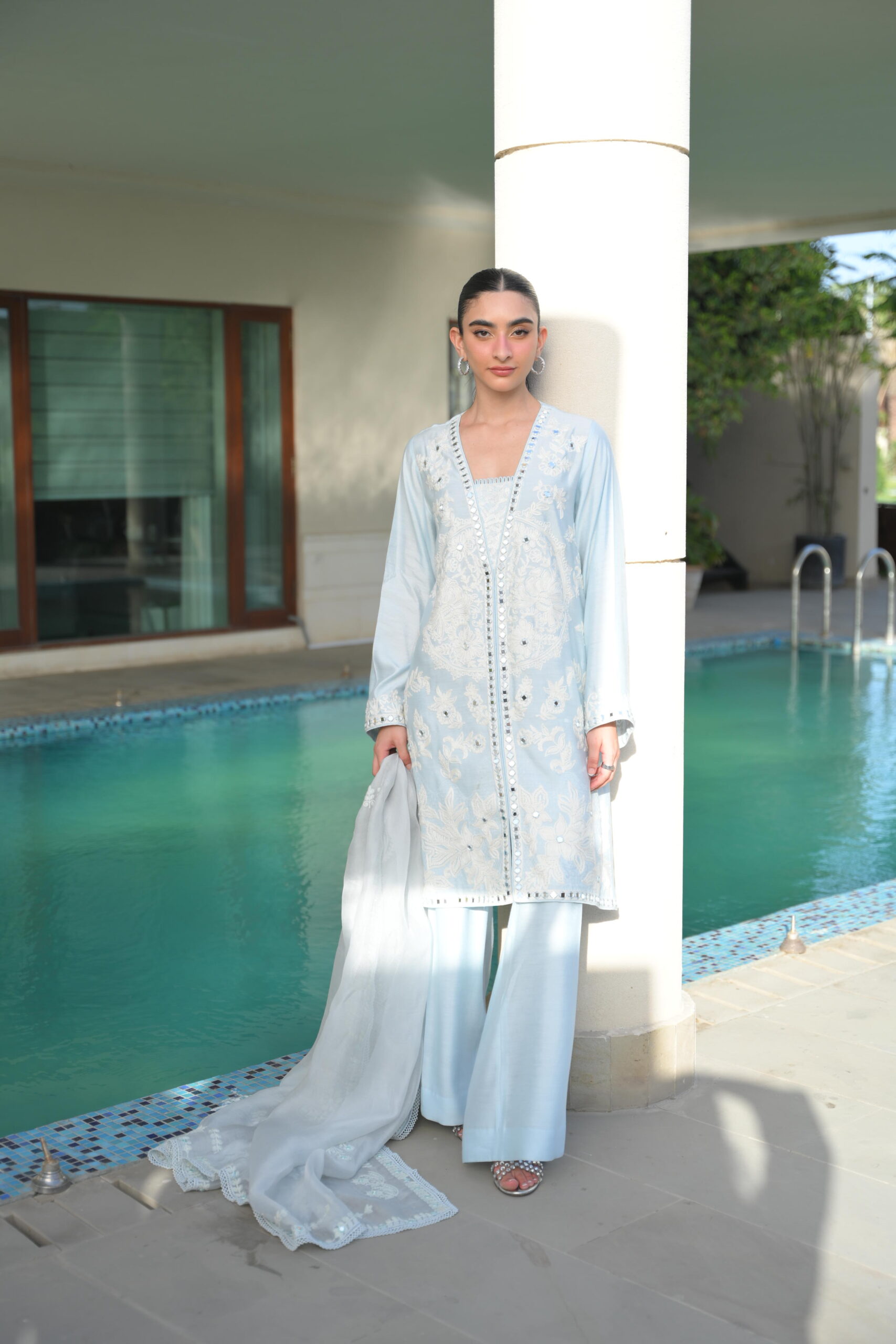 A beautiful powder blue ensemble featuring delicate embroidery with exquisite detailing, paired with an intricately embroidered dupatta and boot cut pants