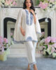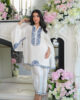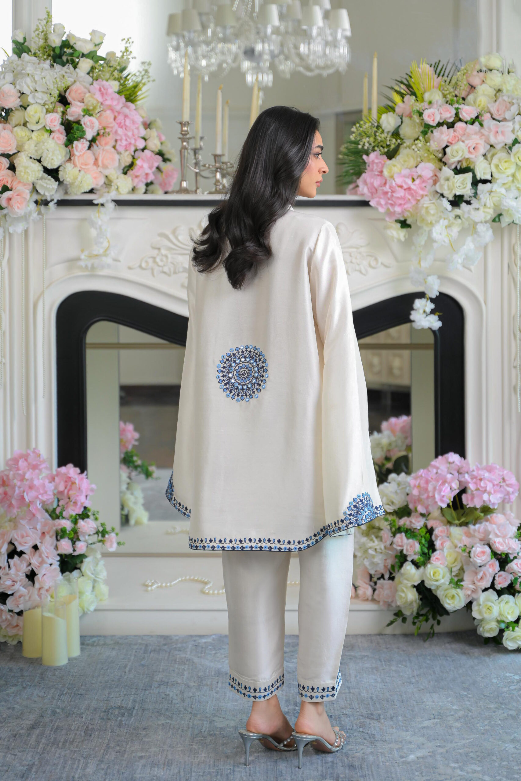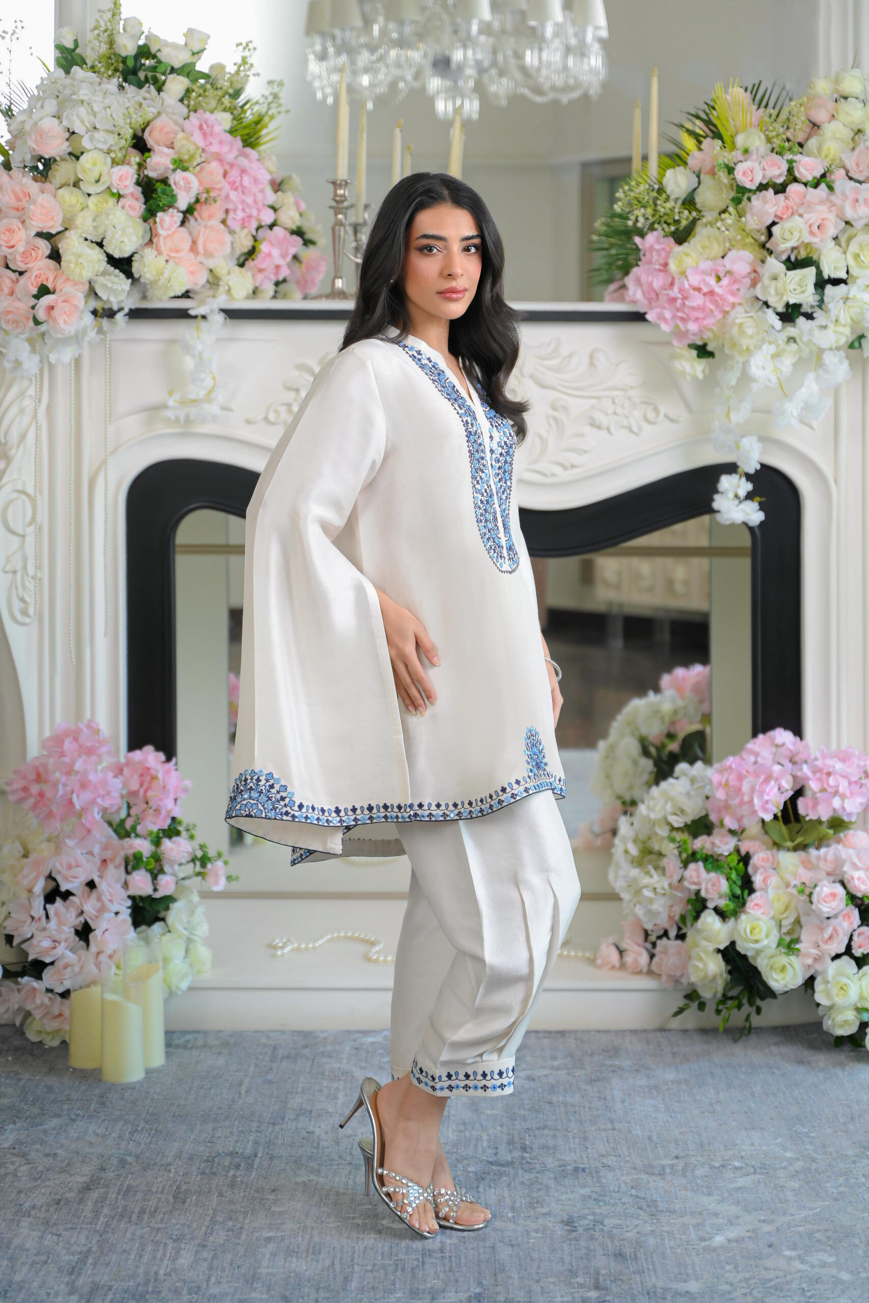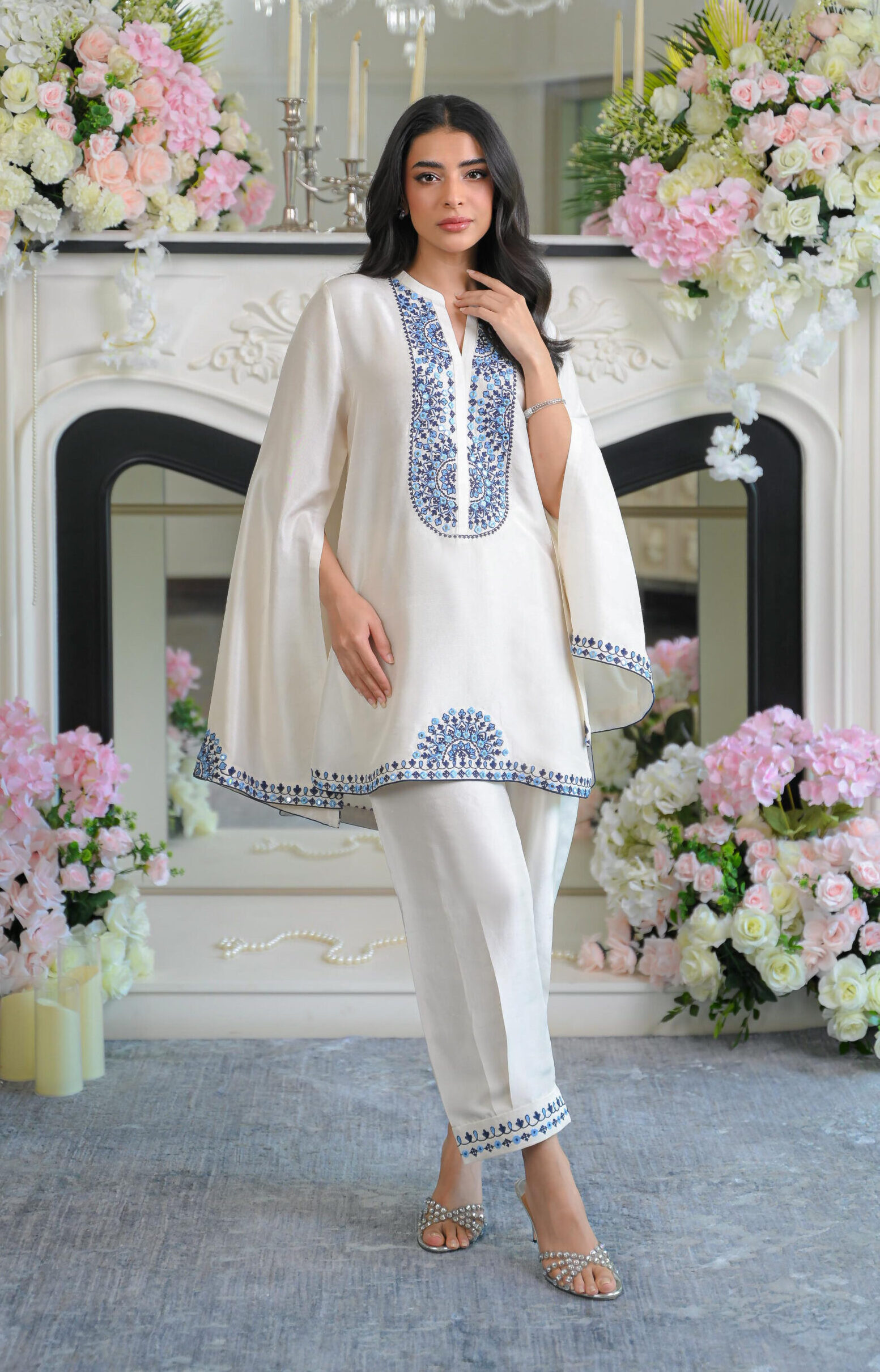 A sophisticated fusion of architectural drape and heritage artistry. This set features a premium raw silk cape shirt with voluminous sleeves and intricate hand embroidery. Paired with tailored classic shalwar for a contemporary look.