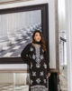 A sophisticated black raw silk outfit adorned with delicate white embroidery throughout, exuding timeless elegance. Paired with a graceful chiffon dupatta and chic culotte pants featuring embroidered borders, this ensemble perfectly blends tradition with contemporary charm.