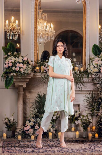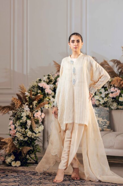 Fabric: Shirt in khaddi net. Pants and camisole in silk. Dupatta in