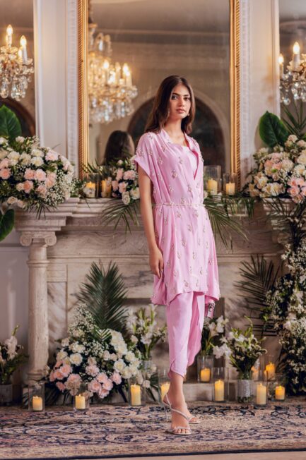 Pants have pleats and organza details.