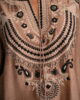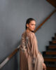 An exquisite khaddi silk ensemble, adorned with delicate embroidery, tassels, and subtle embellishments. Paired with sleek tailored pants and a graceful plain silk dupatta, this look embodies timeless elegance with a modern edge