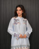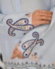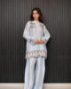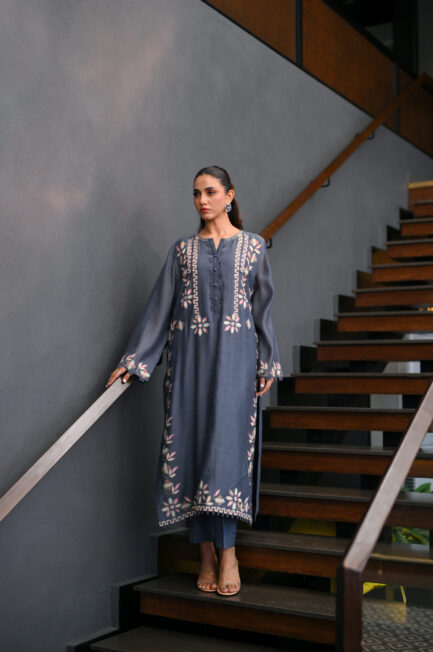 A graceful ink-blue shirt, adorned with delicate and intricate embroidery, exuding timeless elegance. Paired with a tailored farshi shalwar for a regal, flowing silhouette