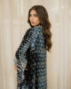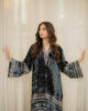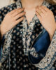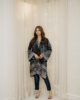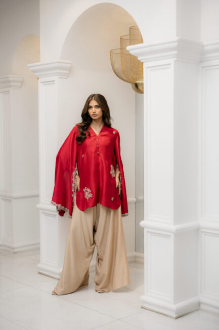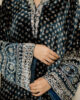 A luxurious pure velvet shirt, featuring bespoke chunri block printing, intricate hand embroidery, and tasteful embellishments for an opulent formal look. Paired with sleek, straight pants for a refined finish