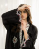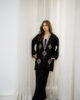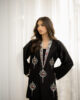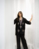 A pure raw silk shirt adorned with meticulous hand embroidery, featuring sleek, intricate patterns and carefully curated embellishments for an effortlessly sophisticated look. The ensemble is elegantly complemented by tailored boot-cut pants, adding a modern yet timeless touch