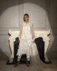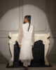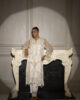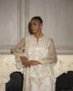 A stunning ivory organza ensemble featuring a fully embroidered shirt, a delicate matching dupatta, and sleek tailored pants for a perfect blend of elegance and modern charm