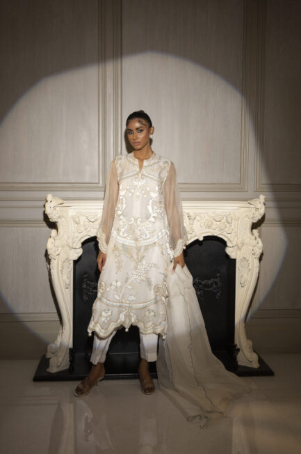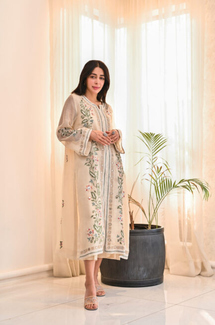 A refined steel-grey pure khaddi silk shirt, exquisitely embellished with intricate embroidery, radiating timeless elegance and sophistication. Perfectly paired with cotton silk pants.