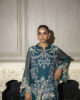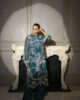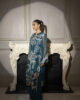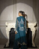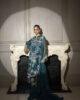 A stunning emerald green organza ensemble featuring a fully embroidered shirt, a delicate matching dupatta, and sleek tailored pants for a perfect blend of elegance and modern charm