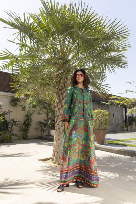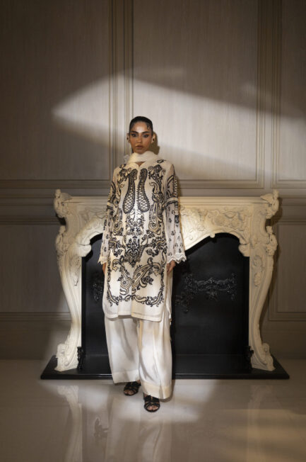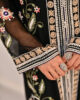 A sublime cotton net front-open jacket, adorned with intricate hand embroidery, shimmering sequins, and exquisite embellishments, paired with chic flared pants for an effortlessly sophisticated look.