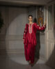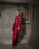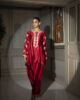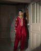 A stunning shiny red raw silk shirt adorned with intricate embroidery on the neckline and sleeves, exuding elegance and sophistication. Paired with a flowing farshi shalwar, this ensemble is perfect for formal events, combining traditional grace with a regal touch