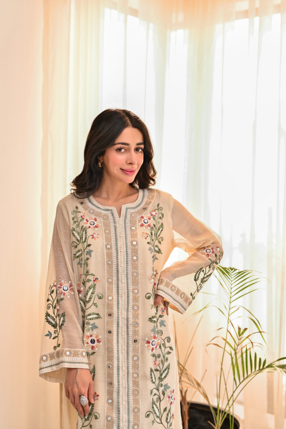 A sublime cotton net front-open jacket, adorned with intricate hand embroidery, shimmering sequins, and exquisite embellishments, paired with chic flared pants for an effortlessly sophisticated look.