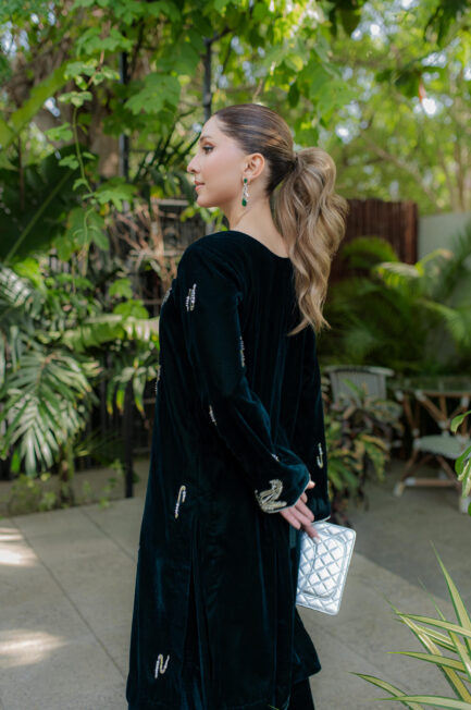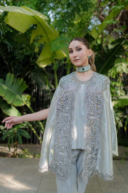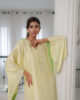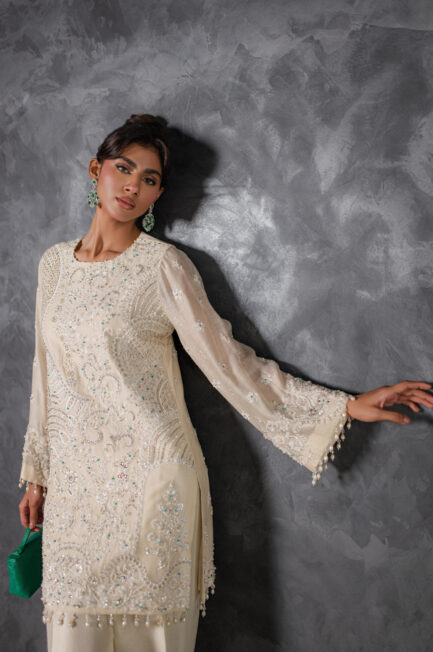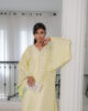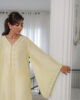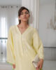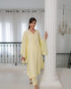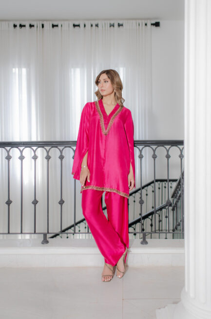 A stunning yellow pure raw silk co-ord set, featuring a long shirt with dramatic sleeves. The intricately embroidered neckline, adorned with embellishments, adds a touch of elegance, perfectly complemented by sleek straight pants for a sophisticated finish