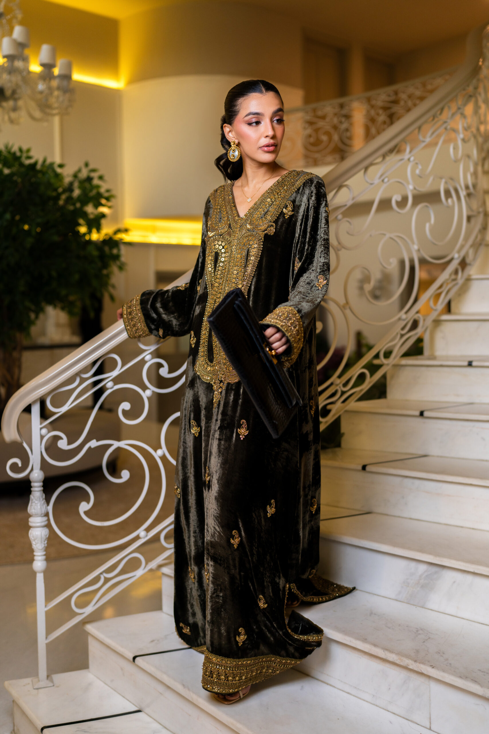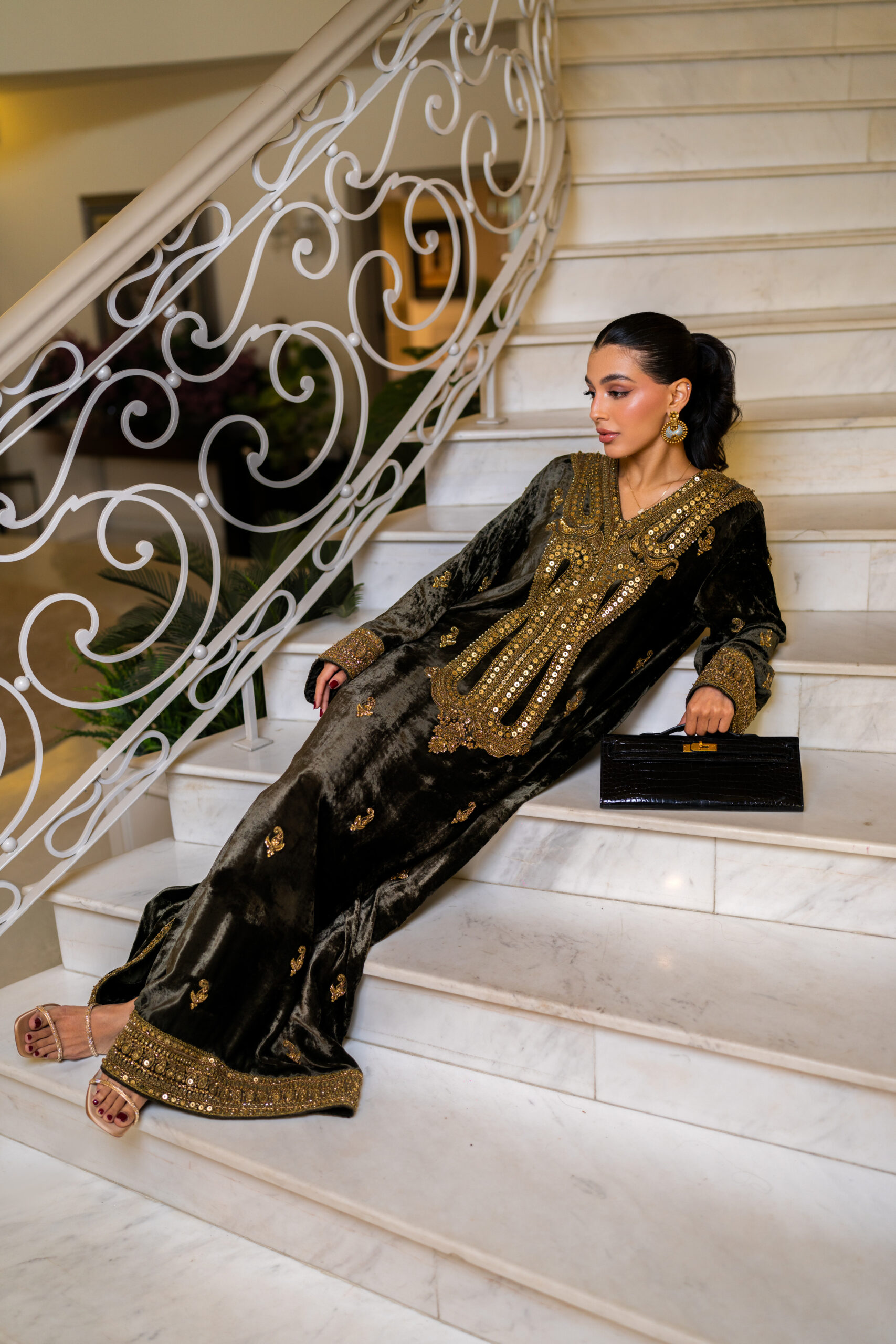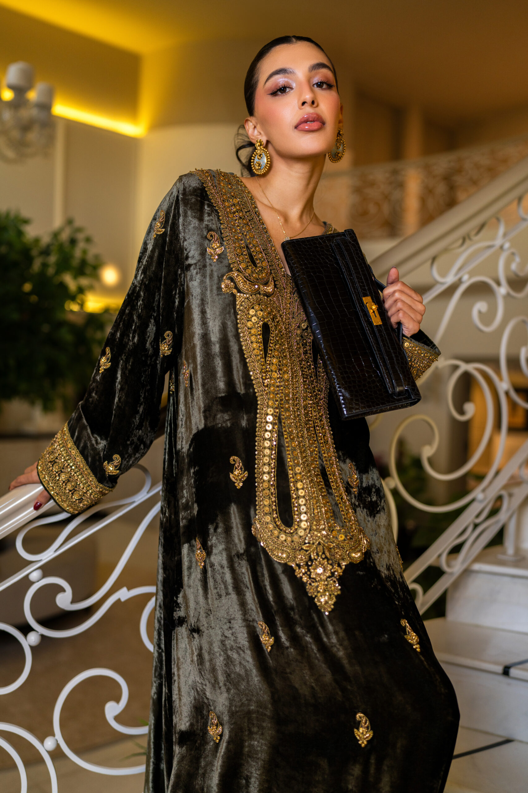 A luxurious pure French velvet kaftan, exquisitely adorned with fully hand-embriodered marori work that showcases timeless craftsmanship. Paired with sleek raw silk pants, perfect for refined festive and evening occasions.