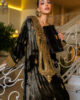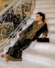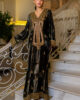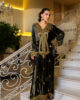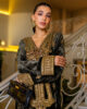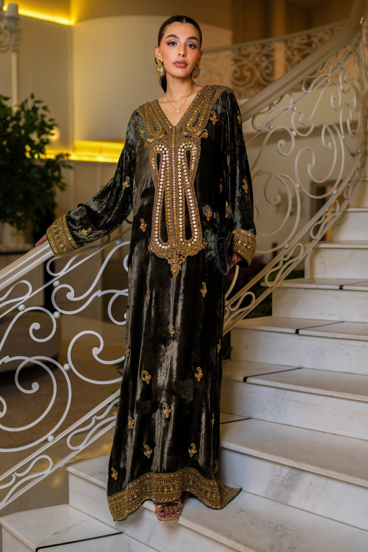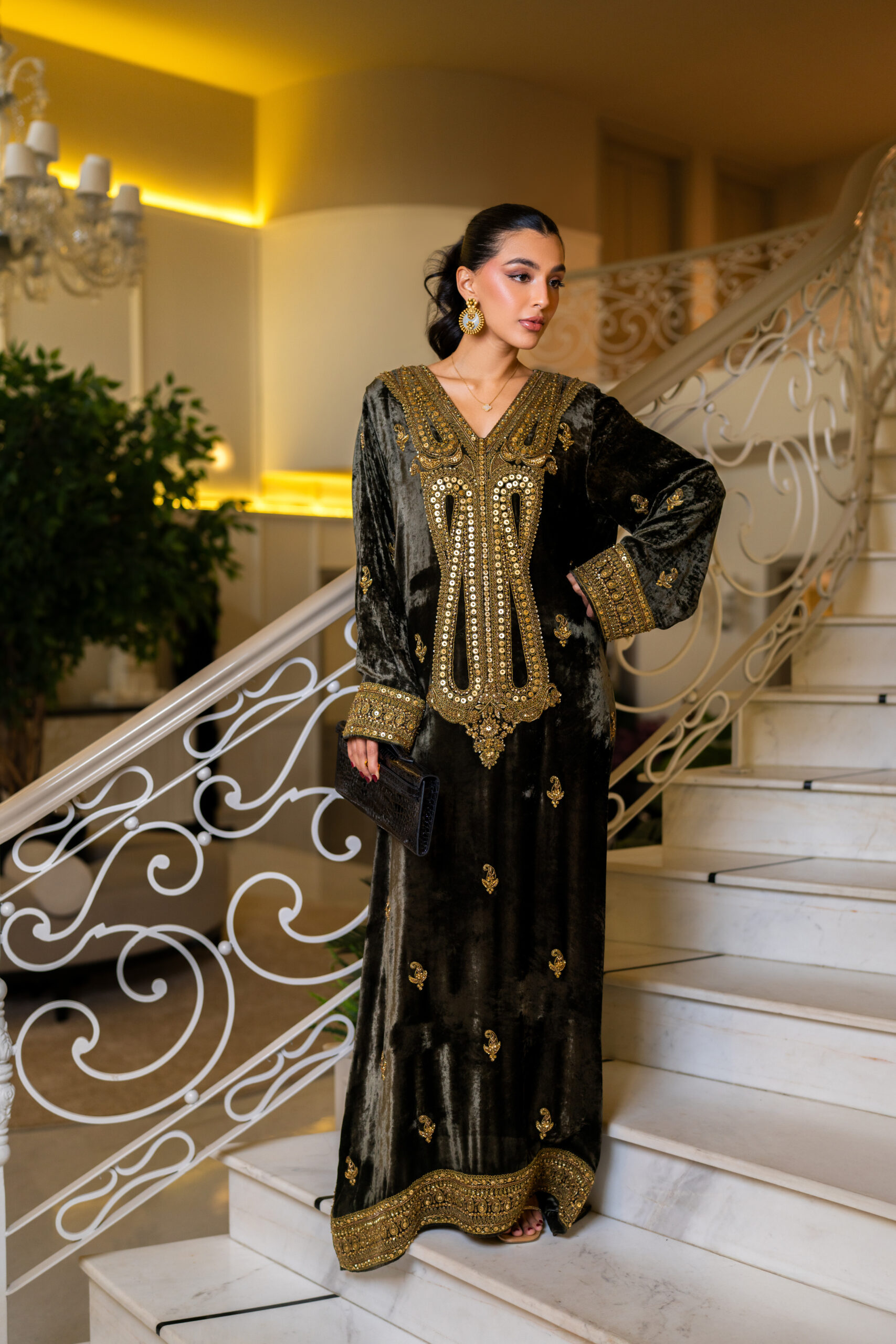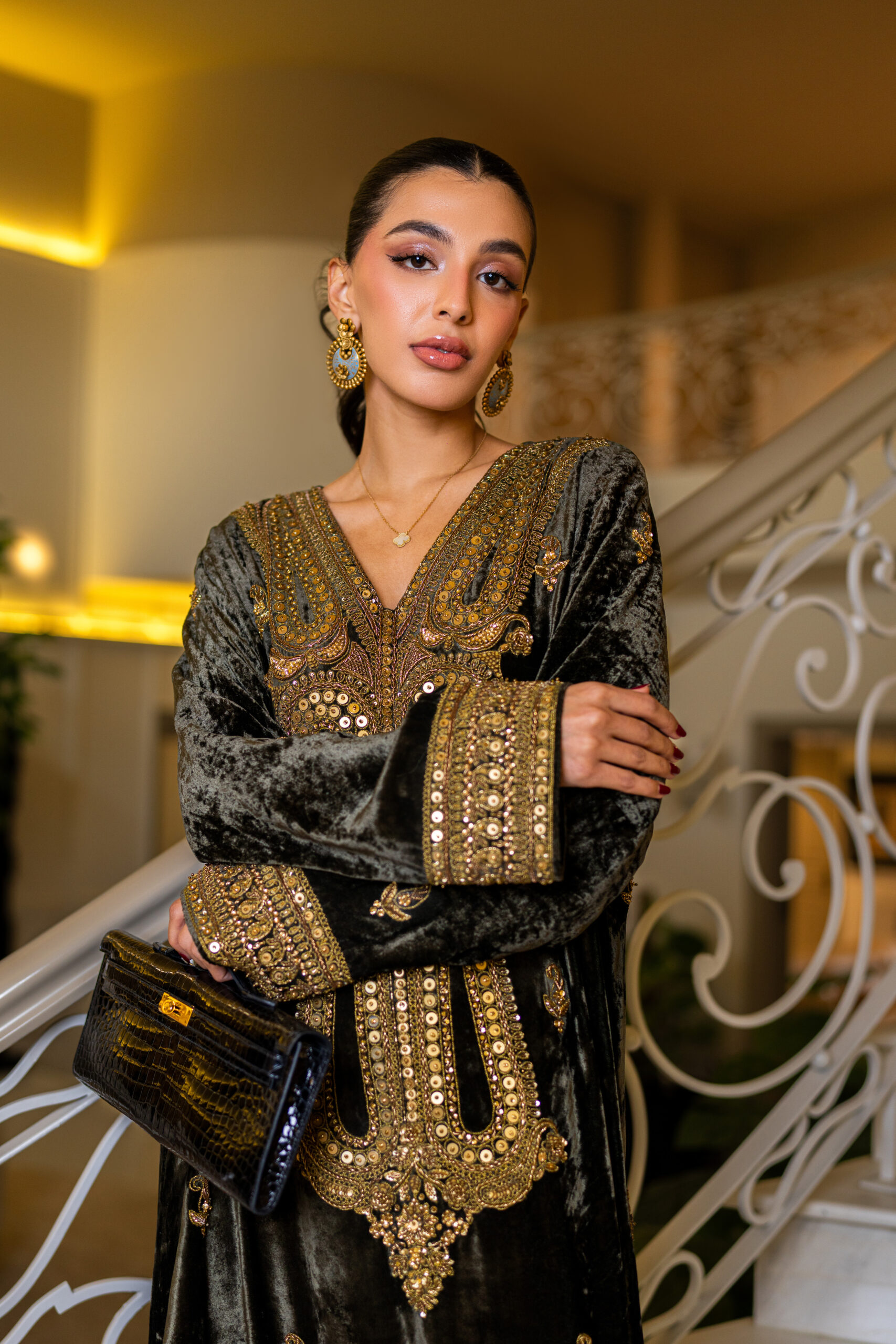 A luxurious pure French velvet kaftan, exquisitely adorned with fully hand-embriodered marori work that showcases timeless craftsmanship. Paired with sleek raw silk pants, perfect for refined festive and evening occasions.