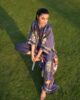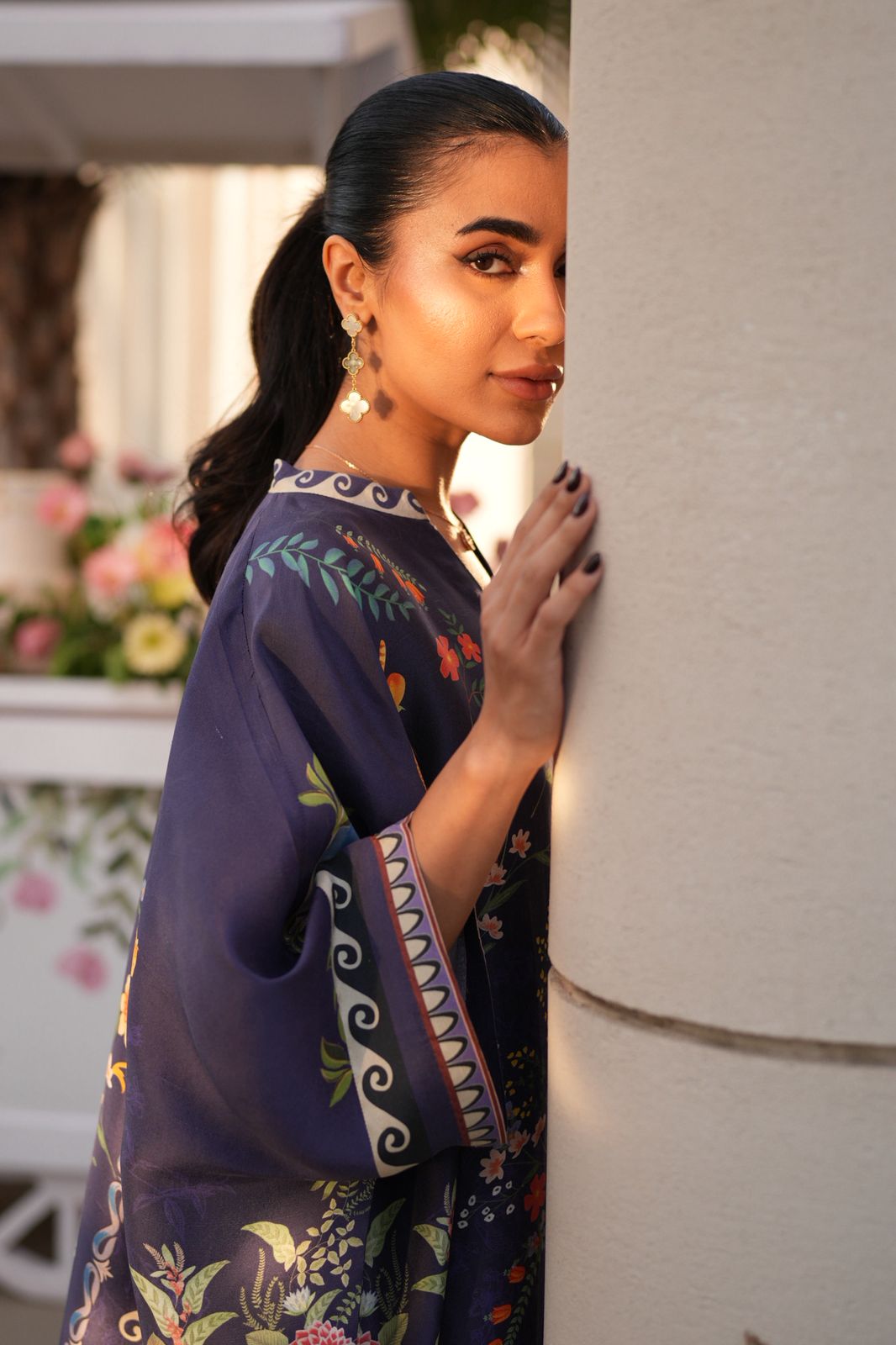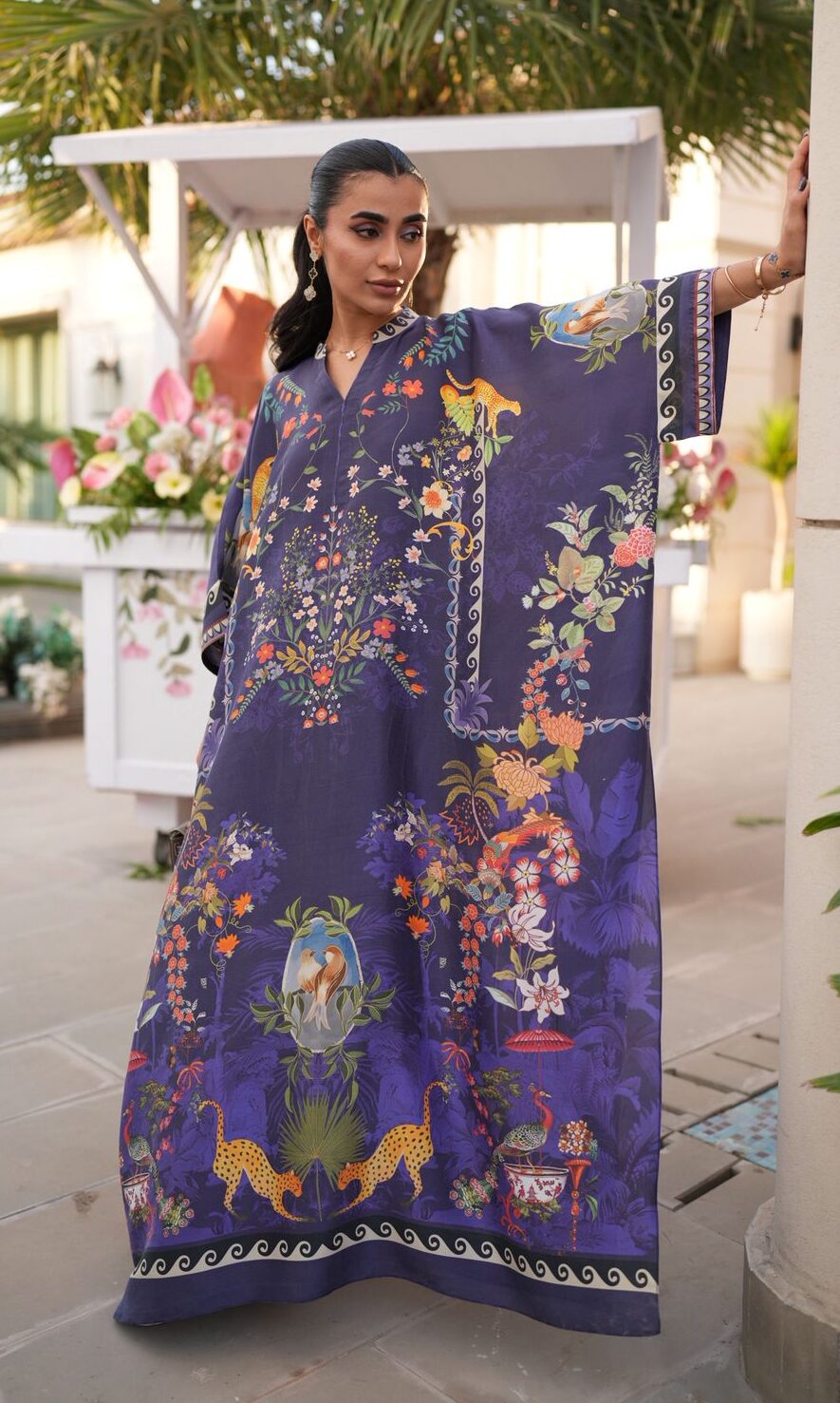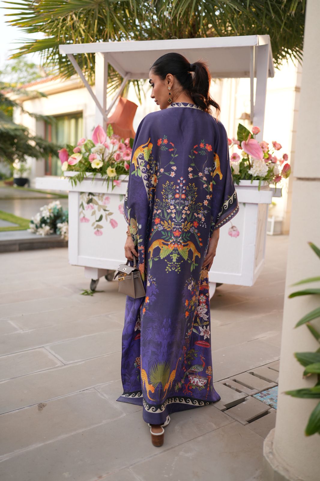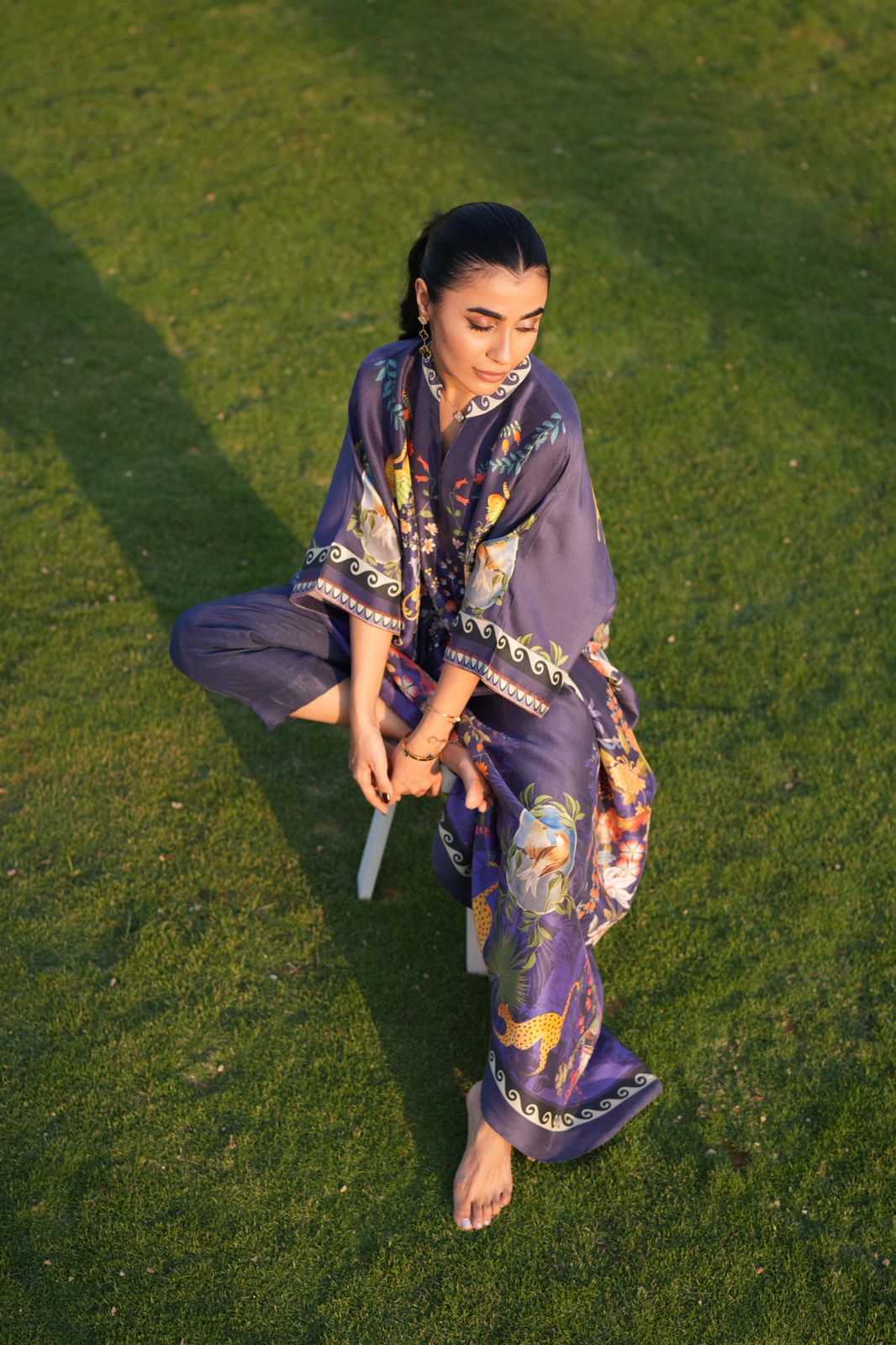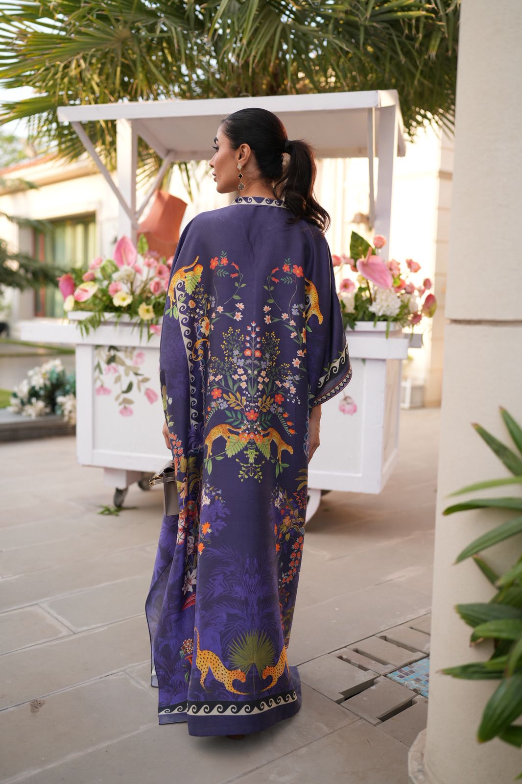 A luxurious digitally printed raw silk kaftan, gracefully draped and paired with sleek pants for an effortlessly elegant and modern look—perfect for refined festive and evening wear